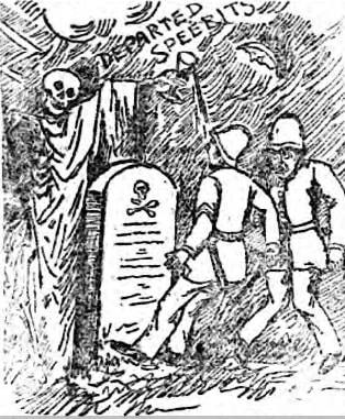 As the group continued past the cemetery, a ghost dressed in white suddenly appeared and ran towards them. The group scattered in fear, save for one ‘sturdy woman of the strong minded class’ who remained stood until the ghost was nearly upon her. Suddenly, she grabbed the ghost, roughing him up and pulling the white cloth from his body. Dragging him back for punishment, when asked about her courage, she simply replied “Can’t fool me, I’ve seen too many men in sheets to get frightened at them.”