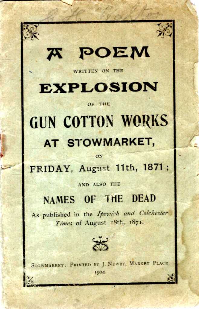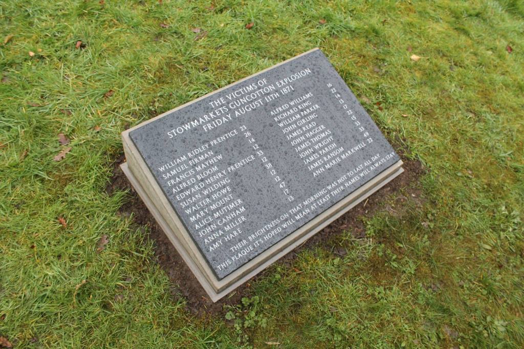 The Stowmarket Guncotton Explosion occurred on a Friday afternoon, on 11thAugust 1871. The explosion killed 28 and injured a further 70. Many of the victims were young people and nine of the dead were children: