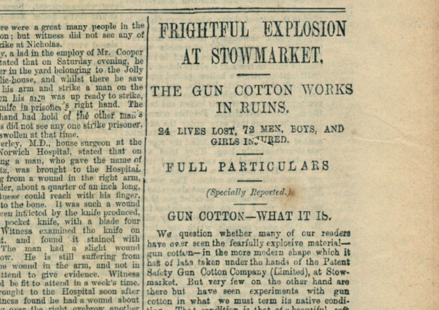 Guncotton was intended as a safer and more efficiently-produced alternative to gunpowder, yet its production methods proved to be far more dangerous than its competitors. In October 1914, another Stowmarket building (used for processing raw cotton) caught fire and illuminated the town, yet thankfully there were no fatalities. The business of guncotton proved lucrative well into the 20thcentury, produced in Stowmarket alone well into 1942. Prentice’s Guncotton Factory rebranded twice before landing on New Explosives Ltd and were successful until the introduction of foreign imports forced them to merge with other companies.