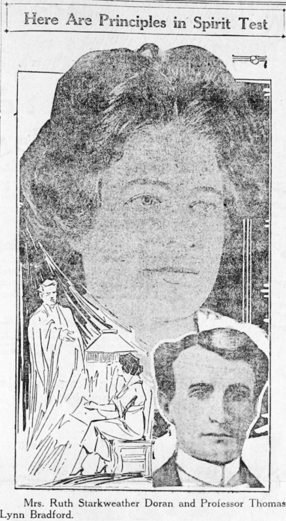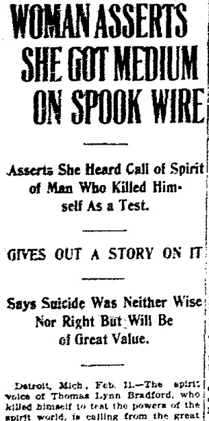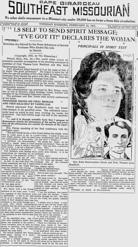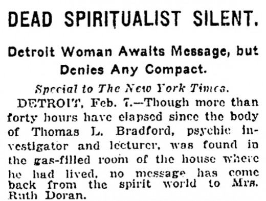 ’Though more than forty hours have elapsed since the body of Thomas L. Bradford, psychic investigator and lecturer, was found in the gas-filled room of the house where he had lived, no message has come back from the spirit world to Mrs. Ruth Doran.’