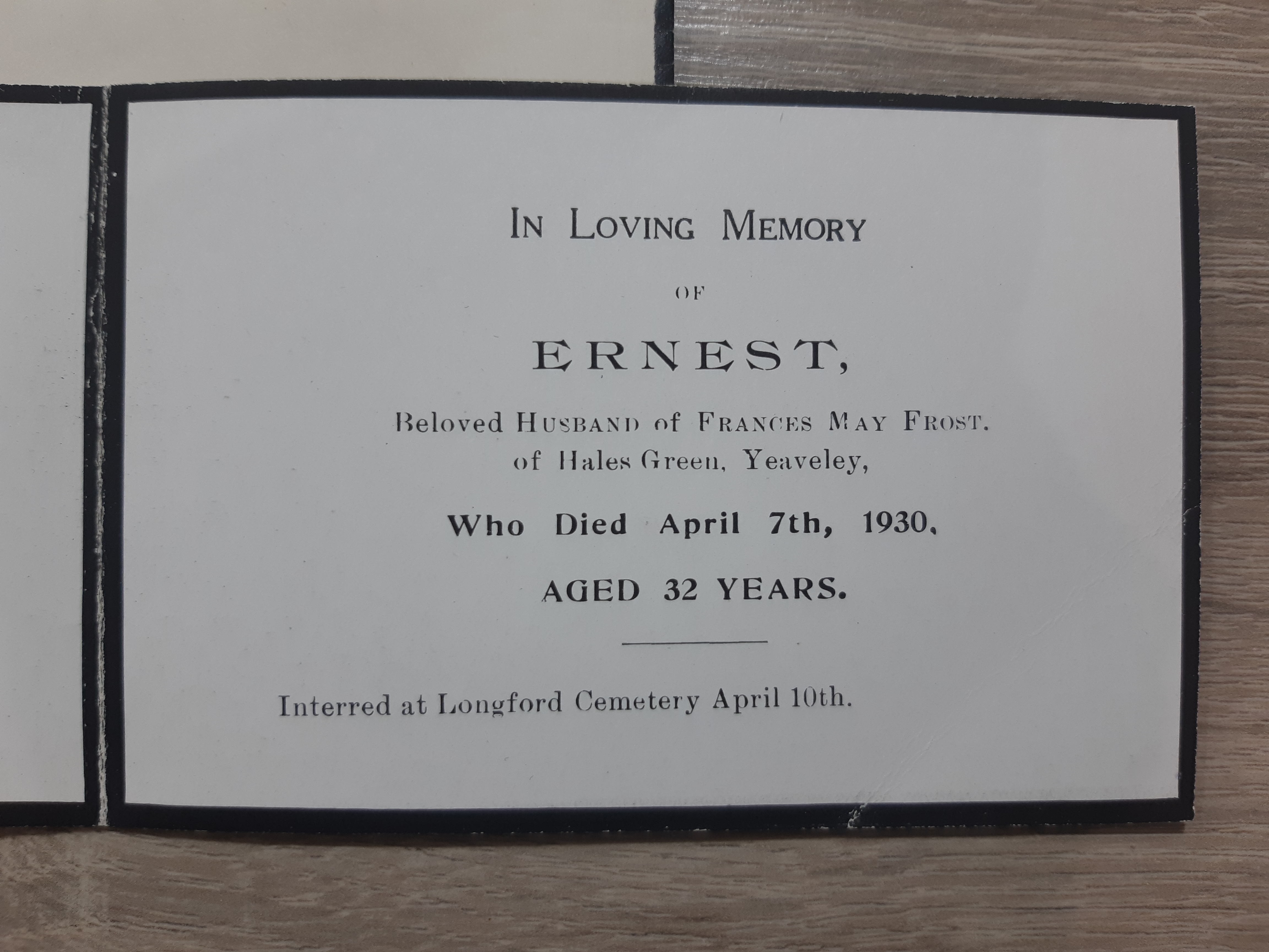 Ernest Frost was born in 1897 (baptised on the 5thDecember) in the small village of Rodsley, Derbyshire. As of 2011, the village population was less than 100, but has a long established history and was mentioned in the Doomsday Book.