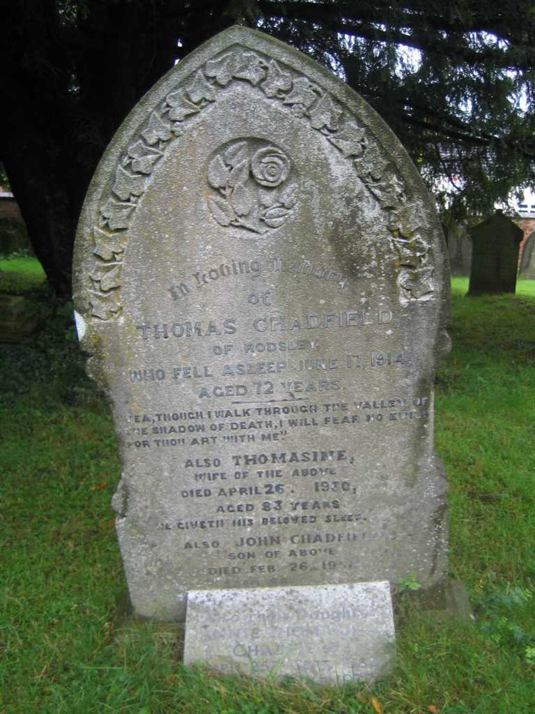 Although we cannot be sure of how long Ernest spent working on the farm, the Chadfield family continued to work the land until Thomas’ death in 1914 at the age of 72. Buried in the Holy Trinity Churchyard at Yeaveley, he shares the plot with other family members: