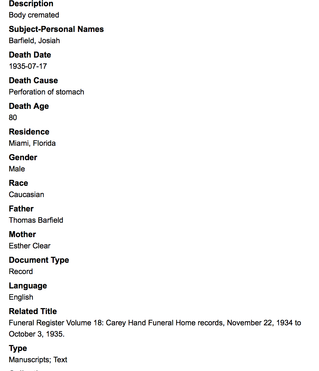 He would die of a perforated stomach on the 17thJuly 1935 aged 80, in Miami, Florida. His body was cremated at the Carey Hand Funeral Home, which still has several locations across Florida to this day.