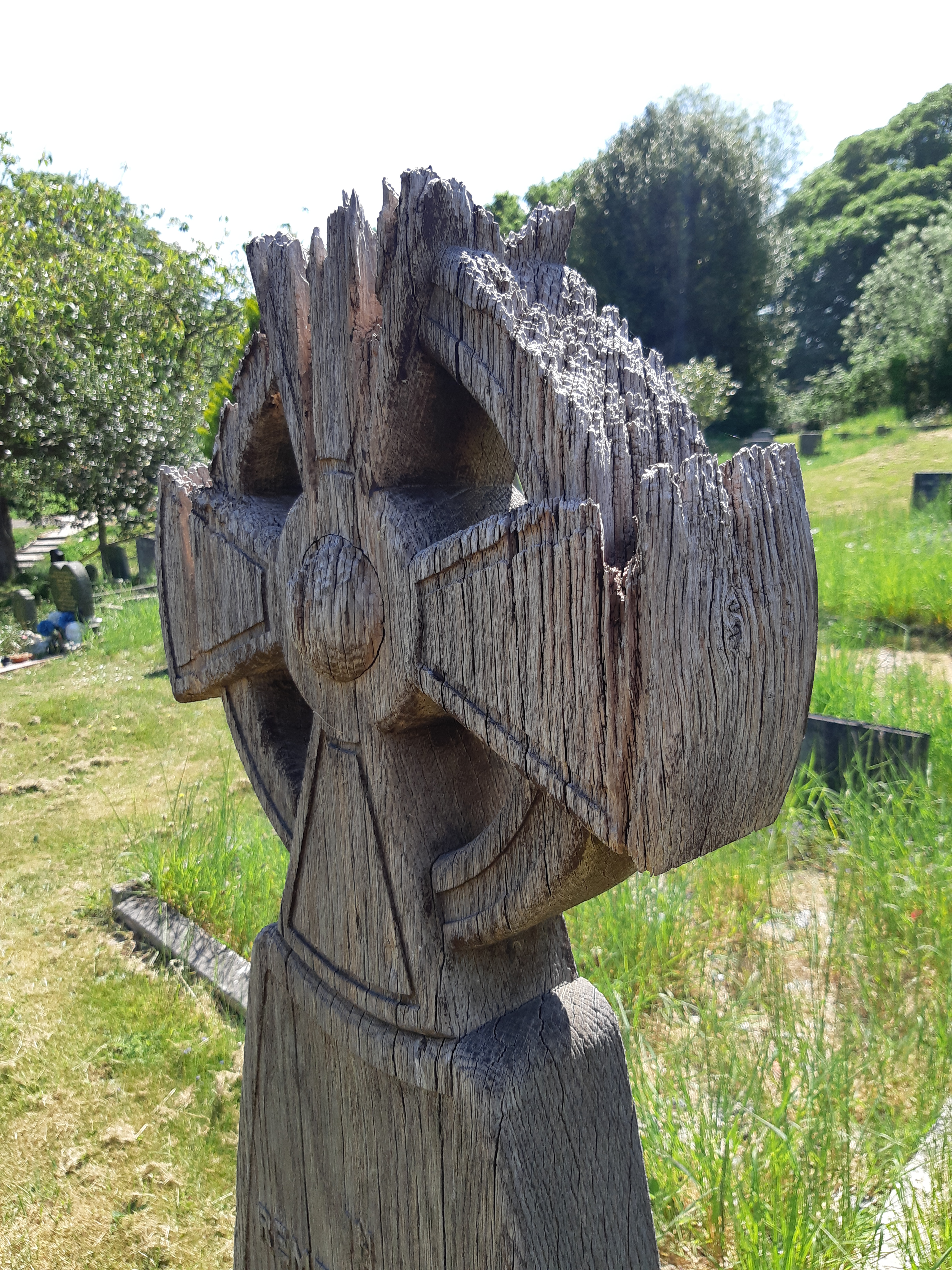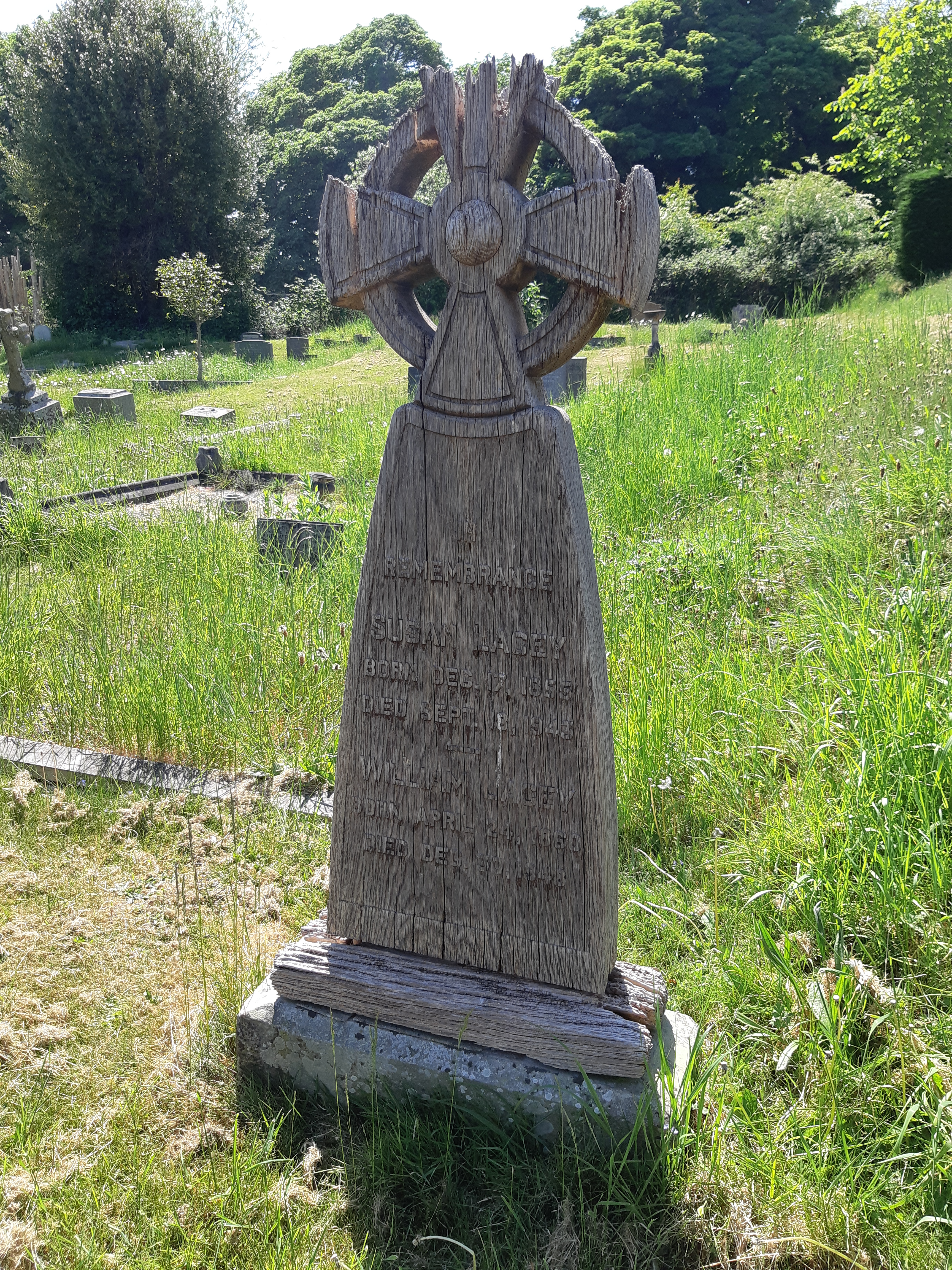 One of the most unusual headstones within the cemetery is that of Susan and William Lacey. Set in the gentle valley leading to the old lodge, their grave is marked by a wooden Celtic cross, which sits weathered but particularly naturalistic against the nearby granite memorials.