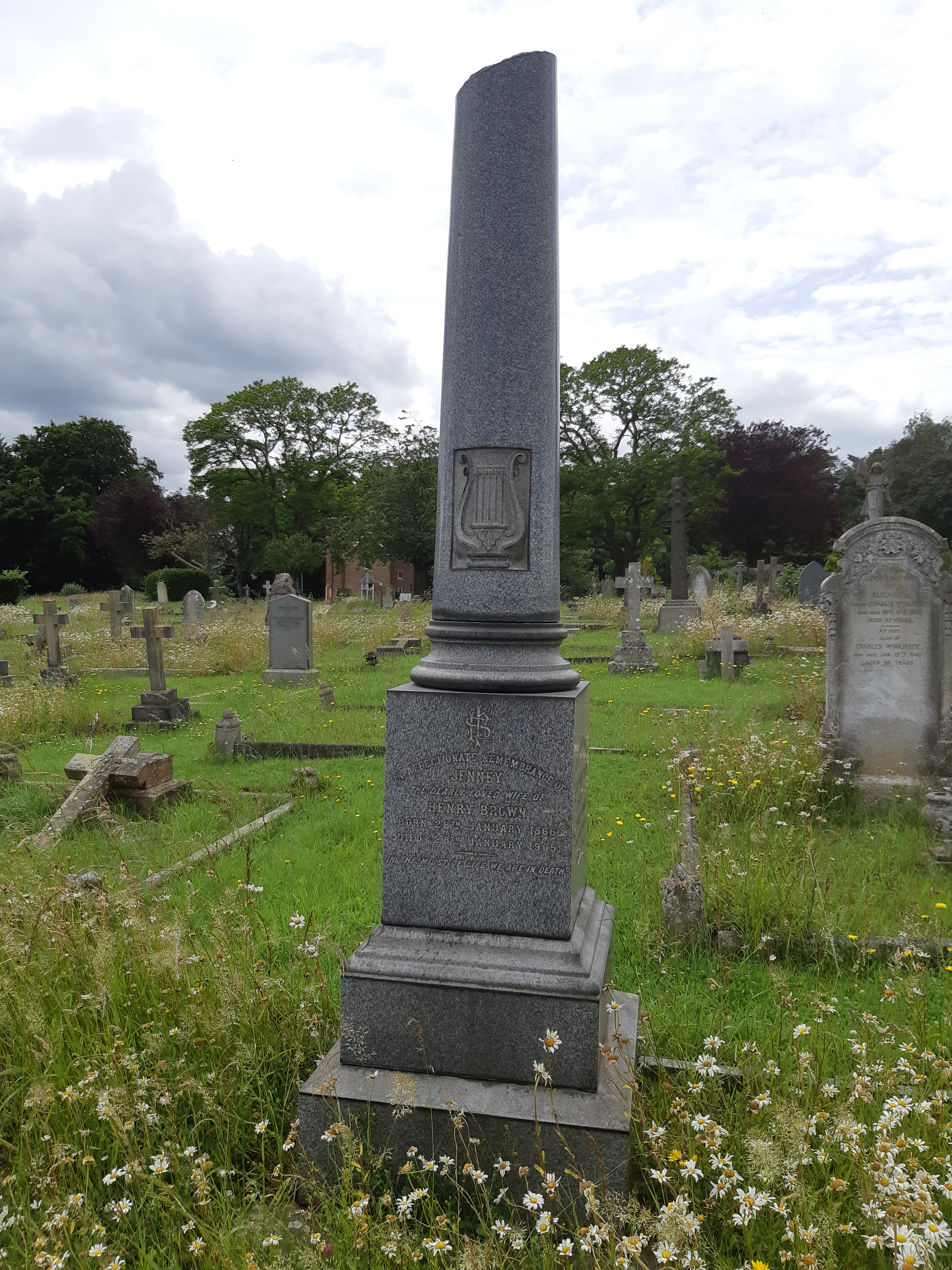 Jenney, ‘The dearly beloved wife of Henry Brown’ has her grave marked by a large grey granite broken column with harp motif. In terms of symbolism, Jenney’s grave is rather self-explanatory; a broken column meaning life cut short, and a harp symbolising a musical talent or devotion to God: ‘Praise the LORD with harp: sing unto him with the psaltery and an instrument of ten strings’ Psalm 33:2.