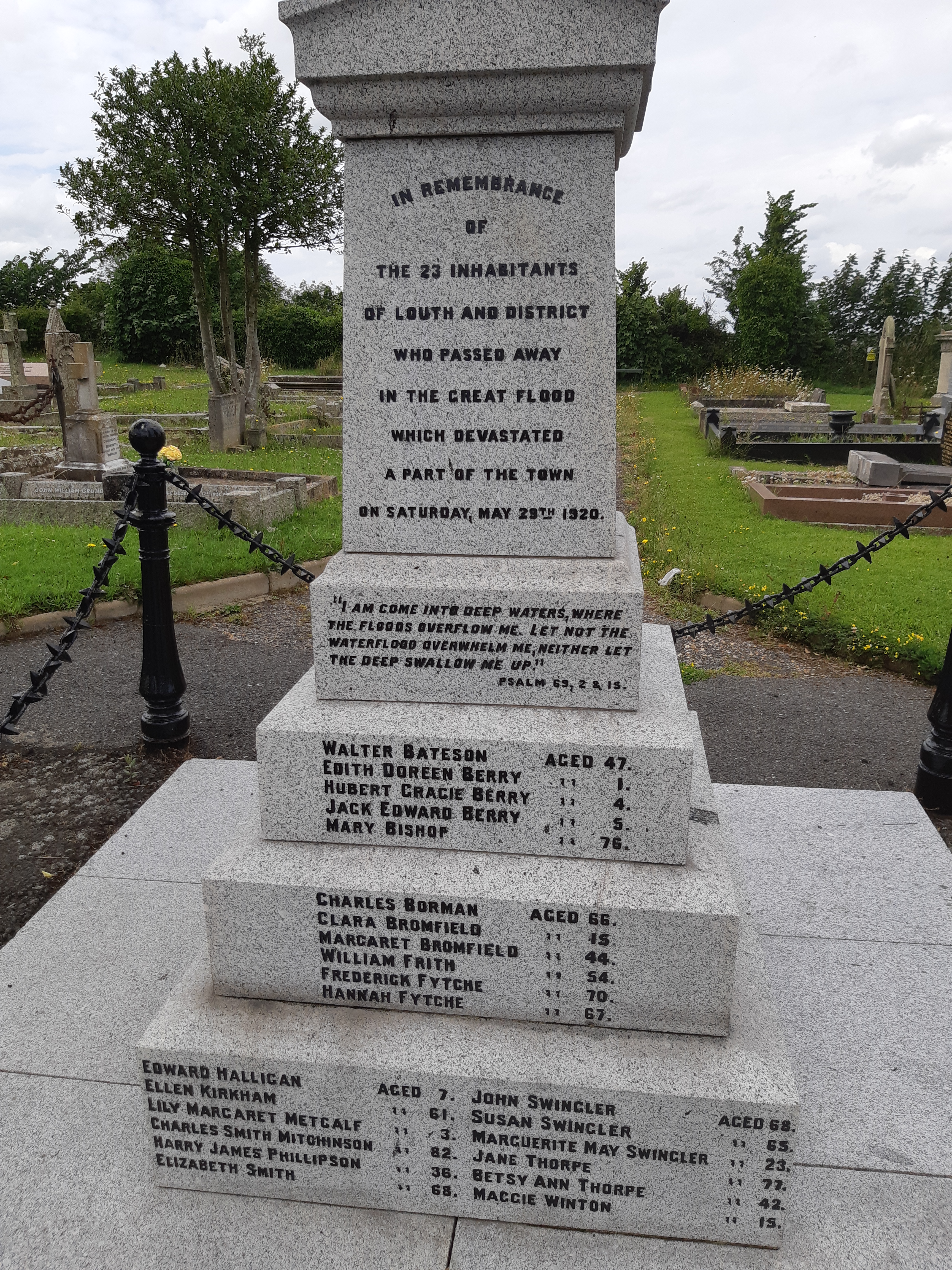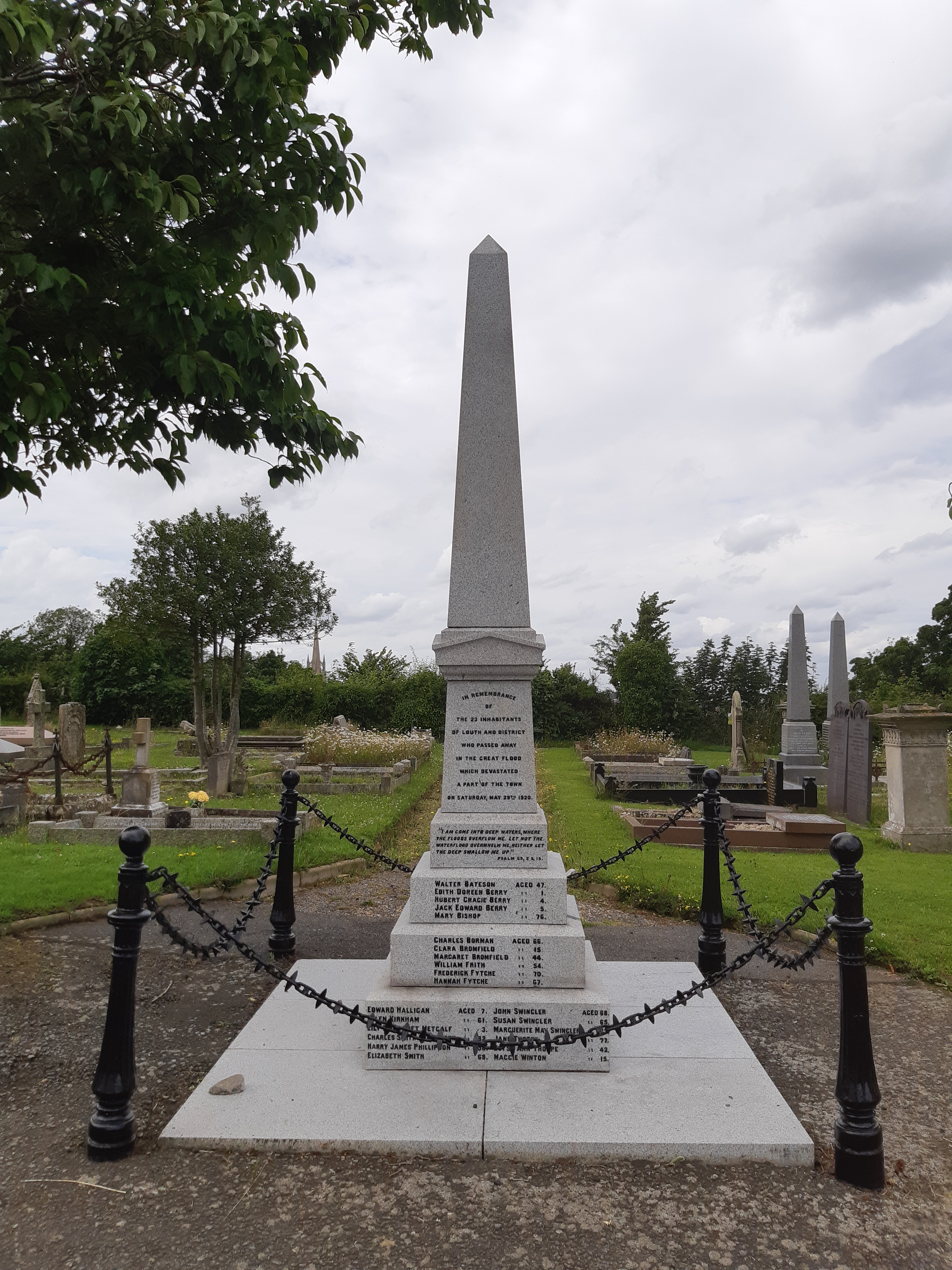 Arguably the most imposing memorial within the cemetery is the obelisk of the Louth flood monument. On Saturday May 29th, 1920, an afternoon ‘cloud burst’ caused the river Lud burst its banks, causing a flash flood that killed 23 people in 20 minutes.