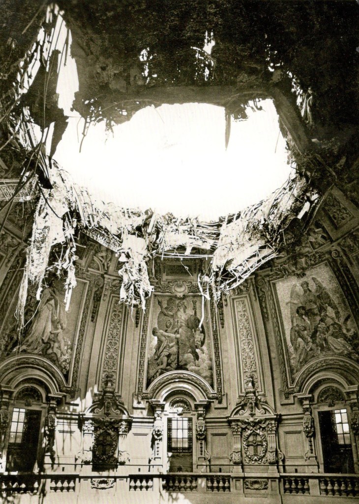 During the Second World War, the cathedral was heavily bombed; the main dome collapsed, smashing through the church and into the crypt, which also partially collapsed as a result. Some of the sarcophagi were badly damaged, and several were completely destroyed. By the end of the war, a quarter of the cathedral was destroyed and parishioners held smaller services in a section of the crypt, which they renamed the ‘tomb church’, surrounded by the bodies of their dead monarchs.