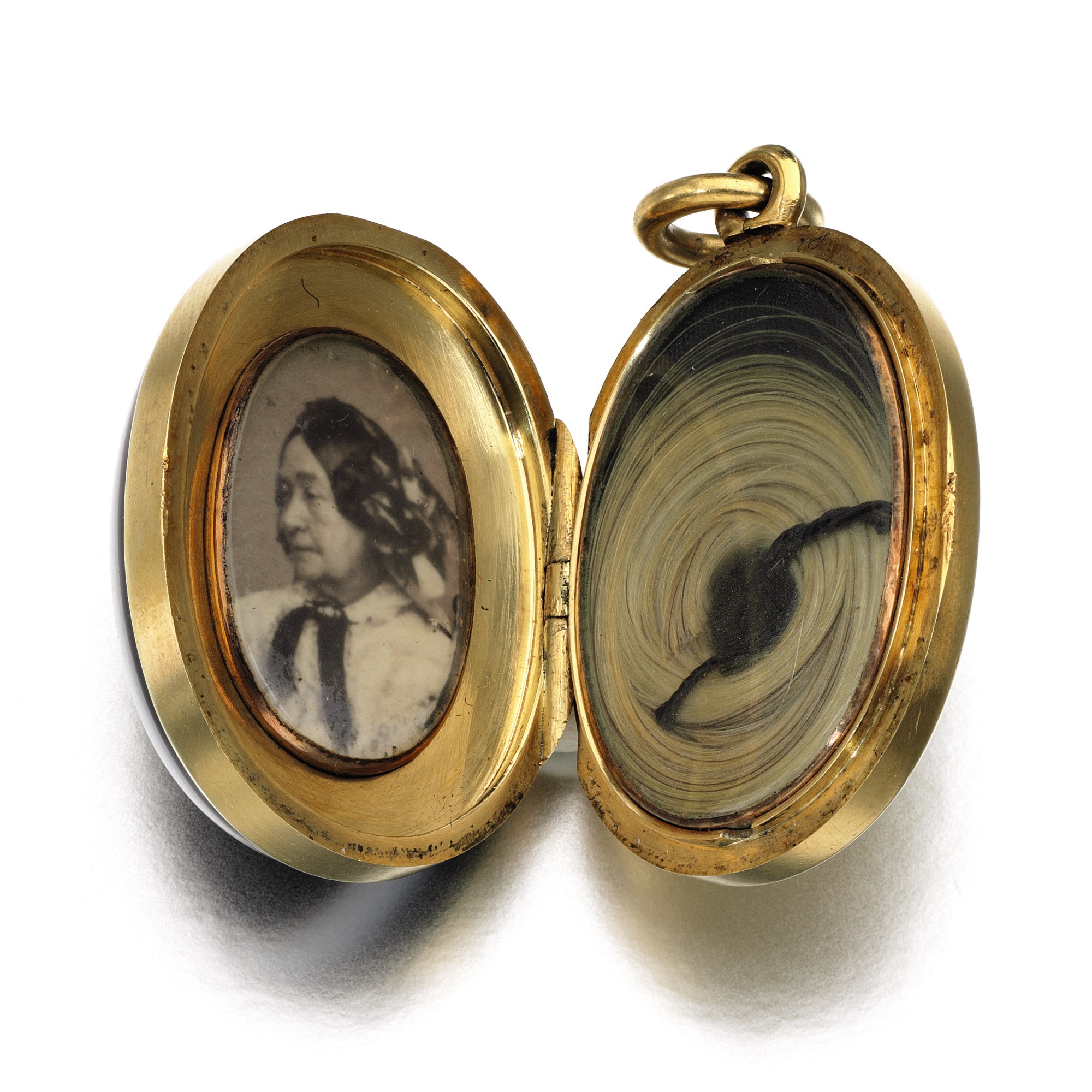 This locket is a fancy little thing, set with banded agate (common in mourning) with a central cushion shaped diamond with star border. Inside, the locket opens to reveal a tiny portrait of the Duchess of Kent and a simple coiled piece of hair, tied with black string.
