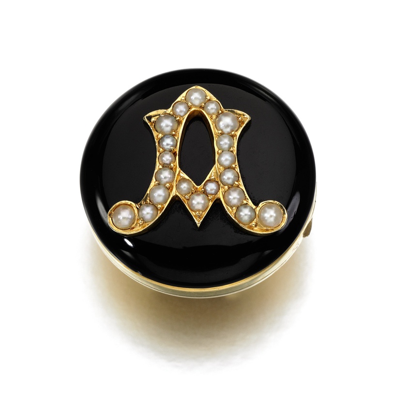Last on our mourning window shopping mission is a deceptively fancy button, also memorialising the death of Princess Alice. Deceptively simple, this little button is a punchy, beautiful and with timeless mourning design. To the front, we have an ‘A’ set with seed pearls (tears, remember) – being tiny pearls, less than 2mm in diameter – upon an onyx cabochon (being representative of the blackness of grief). The button opens to reveal a miniature portrait of the princess, with the back inscribed with the phrase ‘From Mama VRI 7th April 1879’