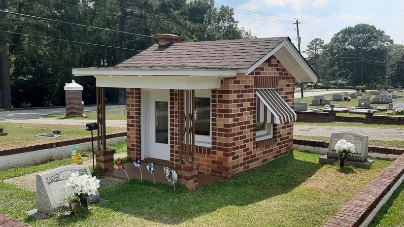 In Oakwood Cemetery, Lanett, Alabama, the grave of five year old Nadine Earles (d.1933) is marked by a substantial brick doll’s house (realistically the size of a Wendy house or play house) that could function as a scaled-down replica of a modest, twee bungalow. Complete with awnings, post-box and flower boxes, the little house is maintained by the city, who add lights and wreaths to the grave in winter, and keep the house looking its best.