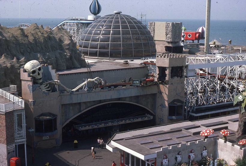 The ride, named ‘Ghost Train’ (no ‘the’), was initially a simple one-storey ride with strangely, no real theme beyond the name. However, it was redesigned by Joseph Emberton and rebuilt in 1936 as an Art Deco double-deck affair. It was developed further in 1957 by Jack Ratcliff when the whole structure was moved to accommodate the huge size of the Wild Mouse ride. By 1973, the Ghost Train was well and truly established as the spooky place to be, when it was remodelled with a castle design and with a looming skeleton above. Since then, the ride has maintained and developed its ghostly displays, mostly using luminescent paint, lit by blacklight, and plenty of special effects. Some of the contemporary displays directly reference horror films and classic novels, such as Dracula, rather than general spooky decoration.