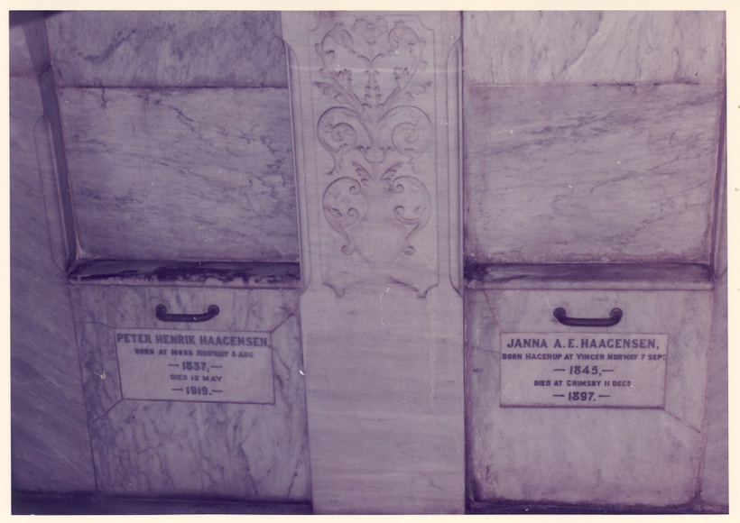 Why the Haagensen memorial was chosen to be placed at Laceby, rather than in closer Grimsby or Cleethorpes burial grounds seems to be a curious choice. Judging by the familiar surnames of large Grimsby business families, it was an existing popular choice for many wealthy families, perhaps due to its rural, peaceful location. However, records suggest that Peter originally wanted to construct his vault at Grimsby cemetery, but was denied permission. What was Grimsby’s loss, is Laceby’s gain.