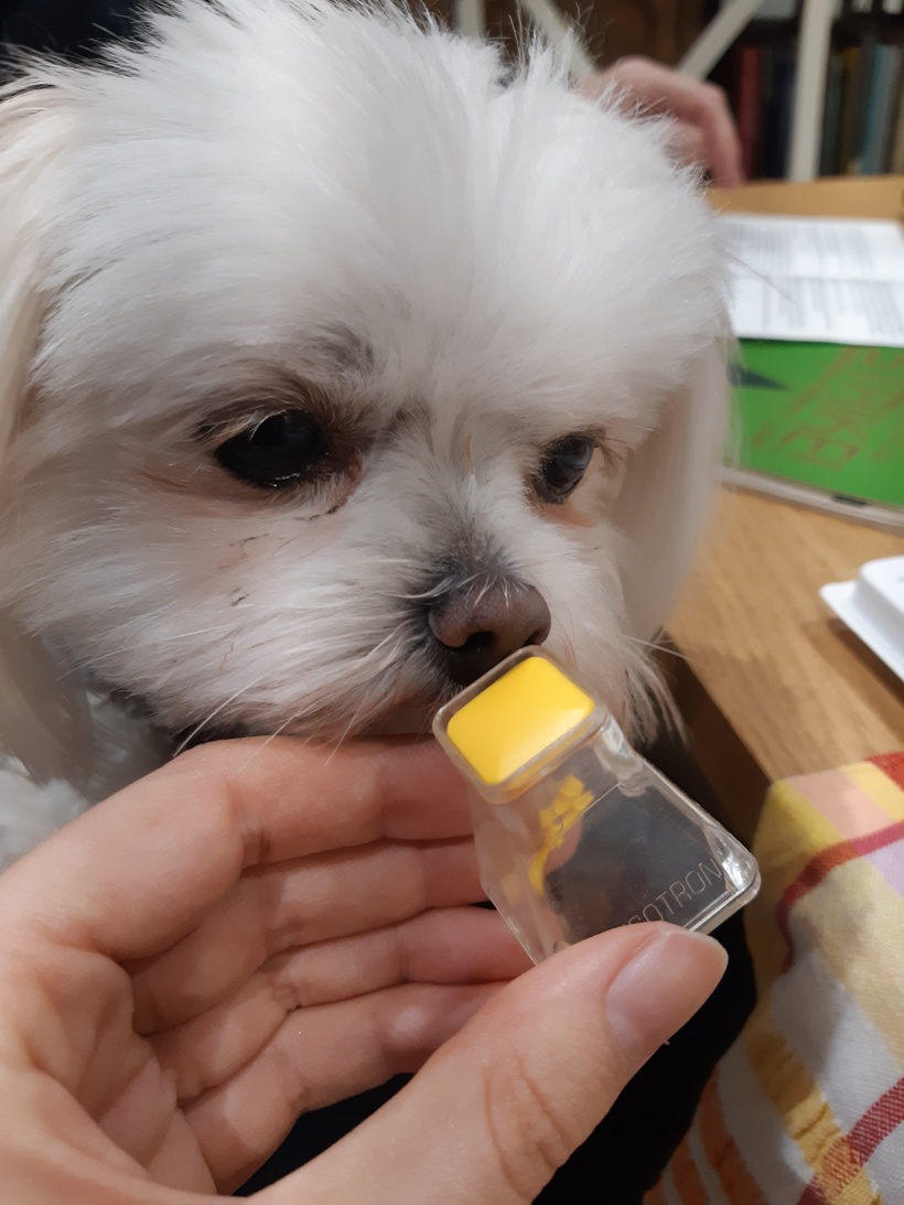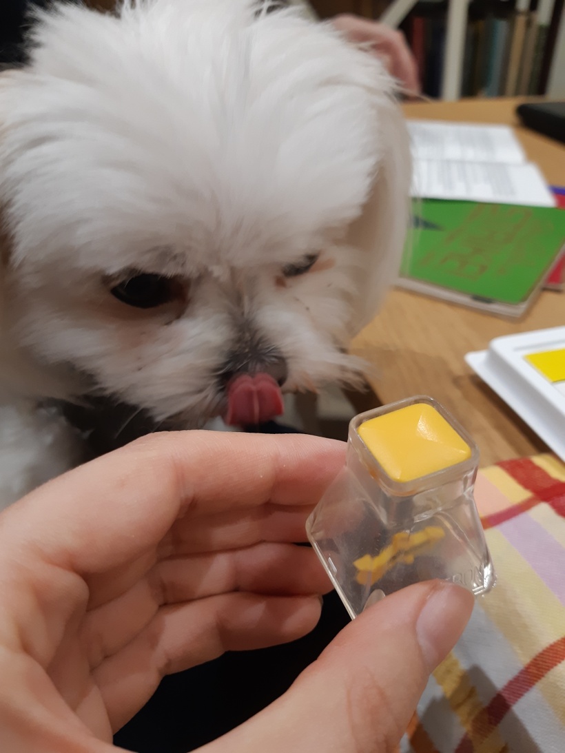 The player who rolls the highest number goes first and moves their Sensotron (teehee) the appropriate number of spaces. One dice has lumps on it, signalling the question number to be asked, the other the number of spaces moved. This already feels needlessly complicated. Together, the dice lead us to a grid reference and I am already bored as this is a bit too much like school geography lessons. Vaffles begins to nibble on the corner of the question book. She’s never been on board with my psychic obsession.