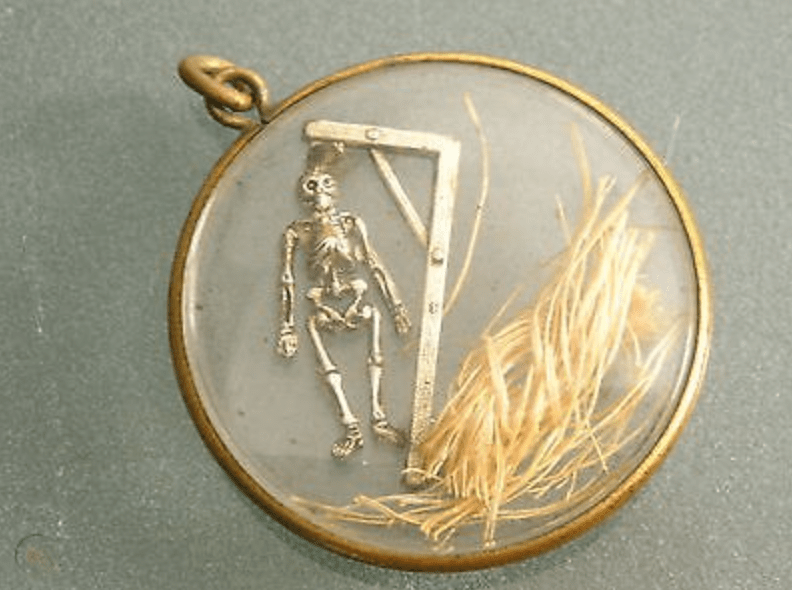 These ‘Hangman’s Lockets’ were simple in construction and could be easily assembled before the condemned man had breathed his last. The locket consisted of a small glass pendant with tiny metal gallows and body – more often than not, a skeleton – suspended on the inside. To link the pendant to a specific hanging, a small piece of ‘the’ rope, being a little twist of fibres, was placed within the locket.