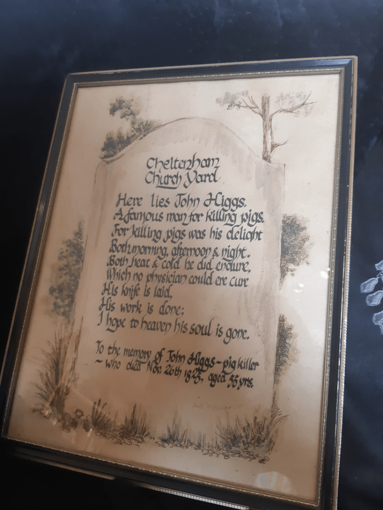 To be more specific, John was laid to rest at St Mary’s Church, which is the oldest building in Cheltenham, dating from the mid 11th century. Much of the churchyard was cleared in the 1950s (a frequent and heart-breaking history for many burial grounds), so only around 50 headstones survive to this day. According to the Friends of St Mary’s, two other curious epitaphs were sadly lost during this period of clearance: