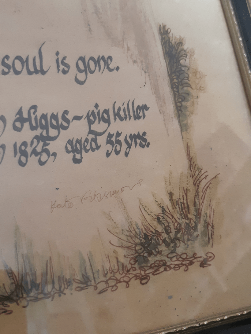Secondly, creative licence has been taken by our artist. Judging by the size of John’s stone, it appears not to be a headstone in reality at all, but a ledger stone or ledger-style grave marker. This means that John’s grave was a large rectangular flat slab, which has always been flush to the ground. It has never stood upright as depicted in my drawing.