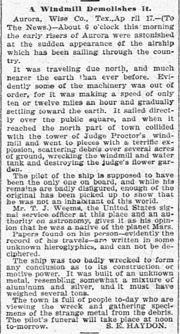 On 17th April, 1897 the Dallas Morning News reported that, two days earlier, a UFO had collided with a windmill on the ranch property of Judge J. S Proctor and had crashed to the ground as a result. The pilot didn’t survive the crash and was found dead inside the wreckage of his ship. Upon examination by the landowner, an army signal service officer and presumably half the population of Aurora, the pilot was deemed to be ‘not of this world’ and even a ‘Martian’, if the signal officer was to be believed.