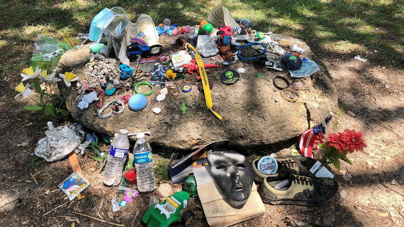 Instead of photographing the alien or alerting the authorities, the people of Aurora thought that the best course of action was to give the deceased pilot a proper send off. A travelling pastor called William Russell Taybor conduced the ceremony where the townsfolk gathered to bury the alien with ‘full Christian rites’. The chosen gravesite was in Aurora Cemetery, alongside the town’s terrestrial burials, where it remains today, with the incident commemorated with a Texas Historical Commission marker. The grave appears to have changed considerably over the years, originally marked with a stone featuring a crude depiction of a cigar-shaped spacecraft. However, according to a blog post by Tui Snider, sometime between 2012-13, this headstone was either stolen or deliberately removed, and has since been replaced with a large rock and a wooden cross. ‘Ned’, as he has been nicknamed by locals, is regularly visited with flowers and trinkets frequently decorating his grave.