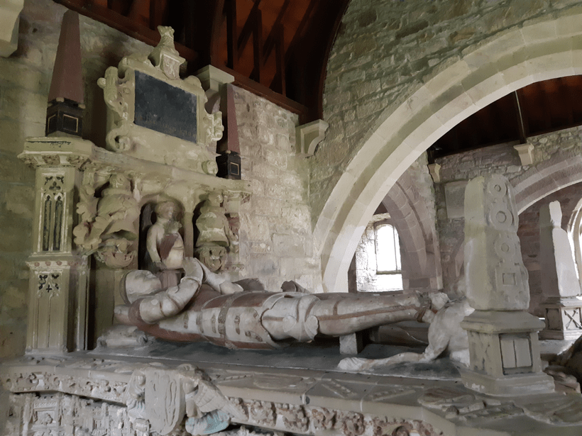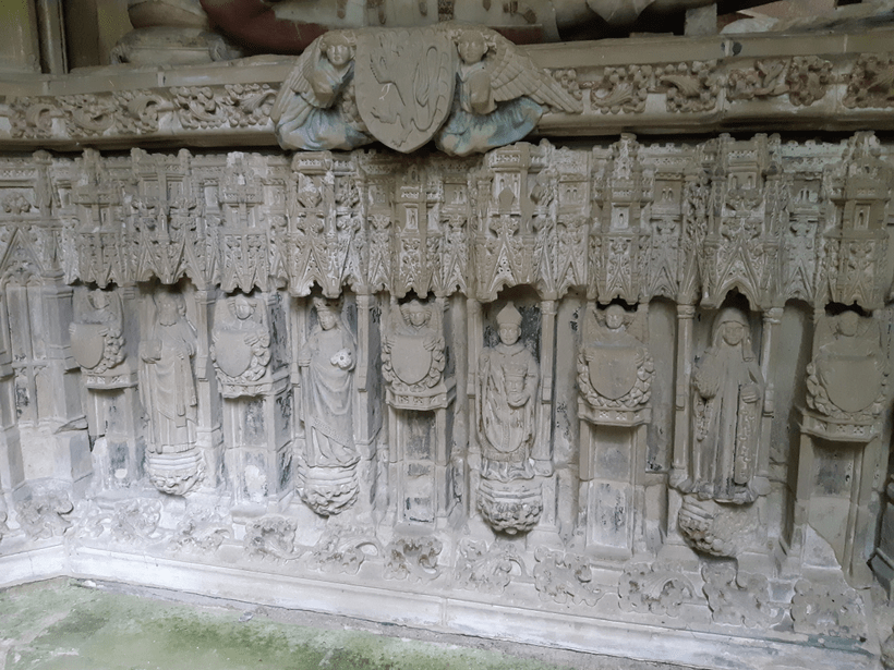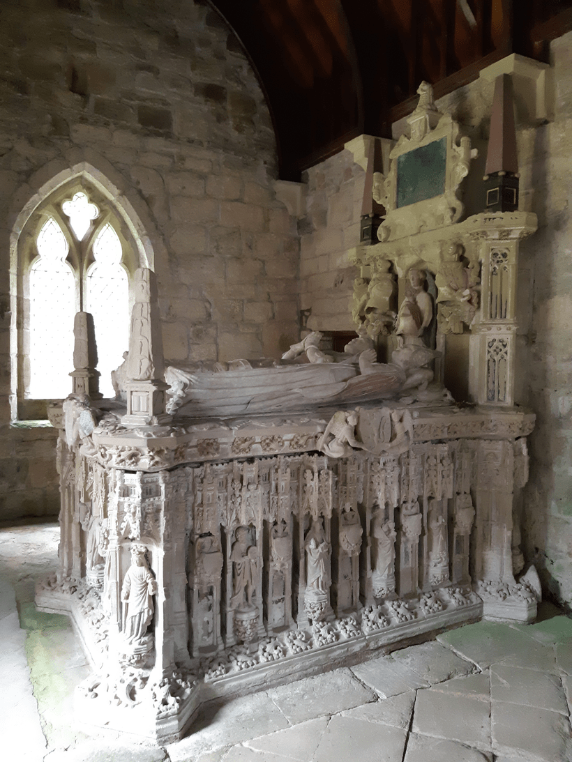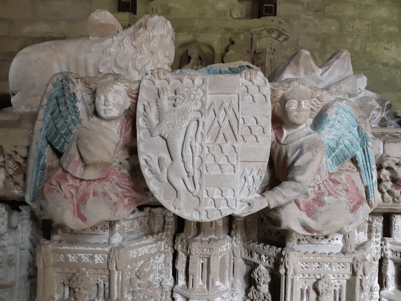 Surrounding the base of the tomb are archways with the detailed carvings of 14 saints, angels and bishops holding heraldic shields, with the centre of each side being marked with a pair of more substantial angels with shields. The couple had three children, with one of their two sons, Ralph Grey II becoming the first of the family to live in Chillingham.
