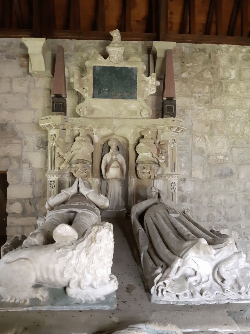 Sir Ralph is depicted dressed for battle and his wife is shown in her finery while they both recline in prayer. At Sir Ralph’s feet is a small lion whereas the creatures at his wife’s feet – perhaps smaller lions or dogs – are severely damaged and lost to time.