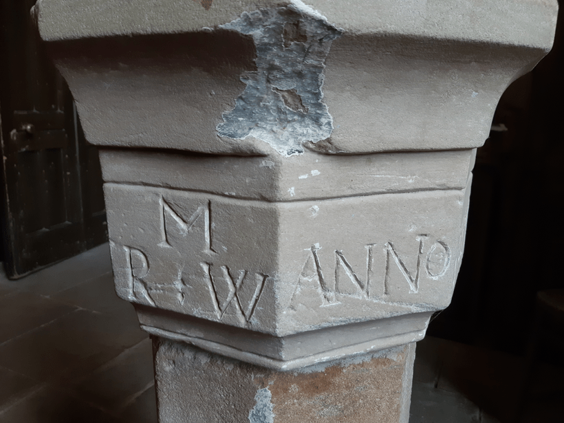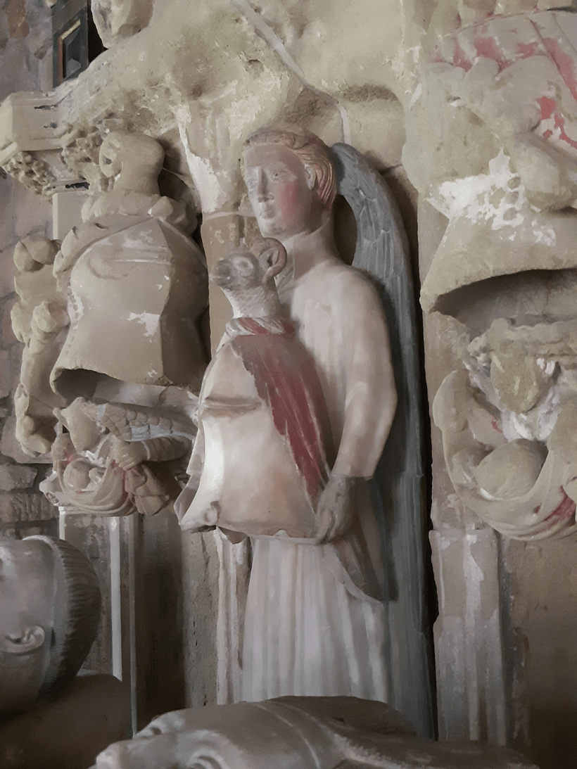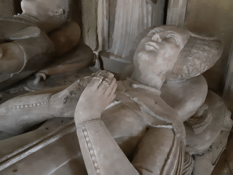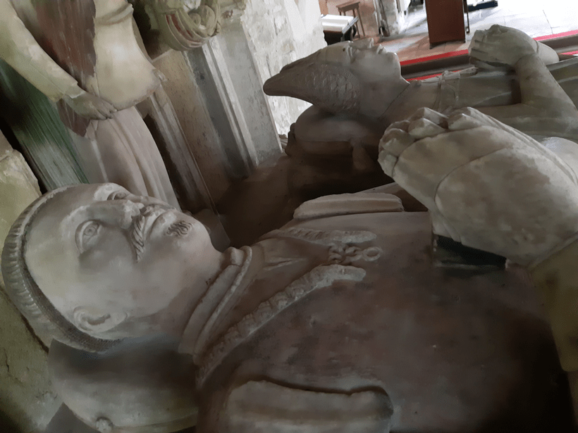 Above sir Ralph and his wife is an elaborately carved reredos (an ornamental screen covering the wall to the back of an altar or monument) depicting more heraldic shields flanked by demi-angels and a rams head. One of the most surprising elements to have survived the centuries is a royalist motto framing it all, ‘De bon vouloir servir le Roy’, which translates to ‘to serve the king with goodwill.’