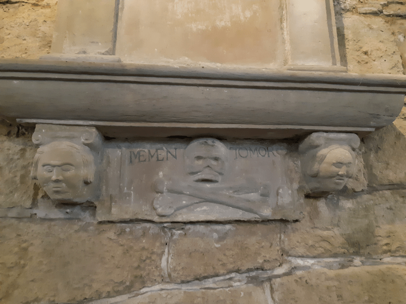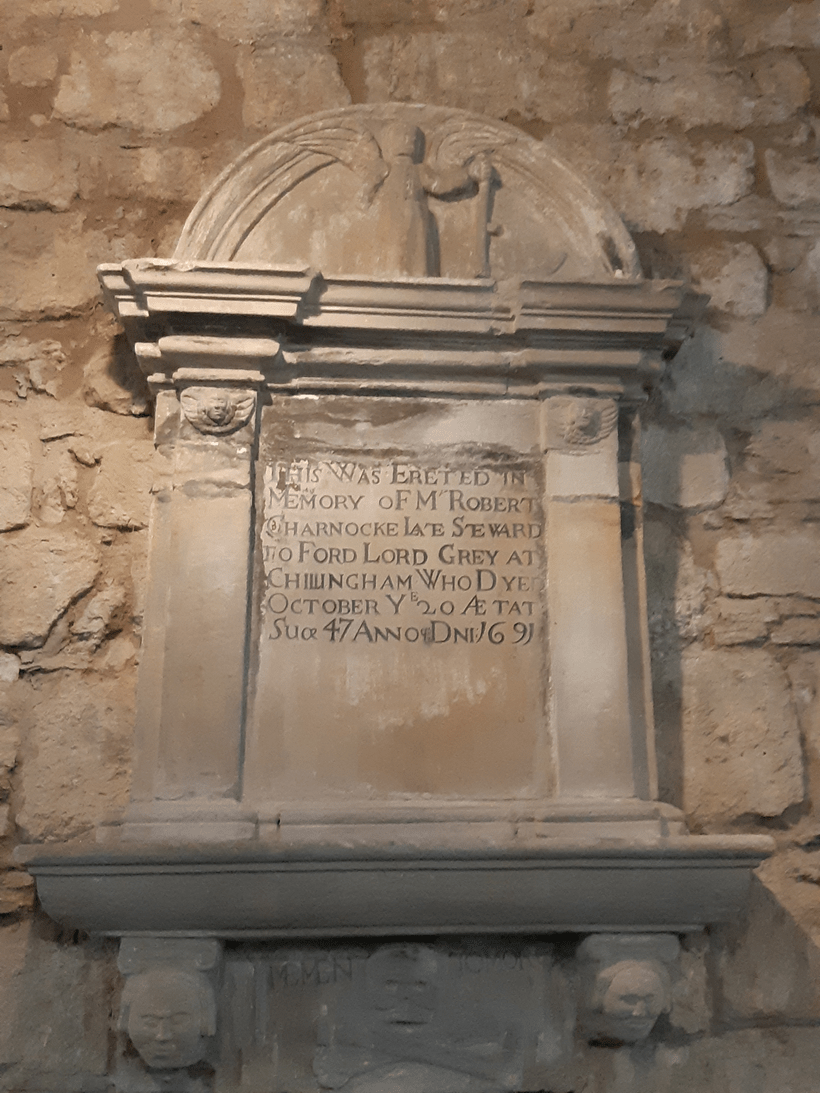 Overshadowed by grander memorials is a curious wall monument to Robert Charnocke who died in 1691. According to his epitaph, he was the steward to Ford Lord Grey at Chillingham. The monument is topped with an angel holding a scythe, whereas the corners have cherub heads, two human heads and a rudimentary skull and crossed bones stating ‘Memento Mori’; remember you will die.