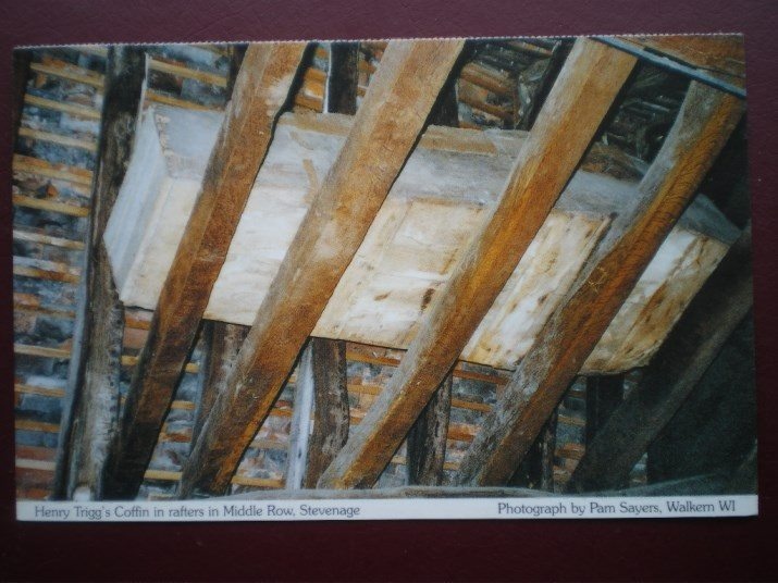 By 1774, the barn had become the Old Castle Inn and, in between escaping a series of nearby fires, Trigg’s coffin had become quite the tourist draw. Visitors to Stevenage would pop in to the Castle Inn for a drink and gawp at the coffin in the rafters for centuries to come. Several checks were made of Trigg’s coffin over the years, most notably in 1831 and 1906, by which point the coffin was said to hold most of a human skeleton.
