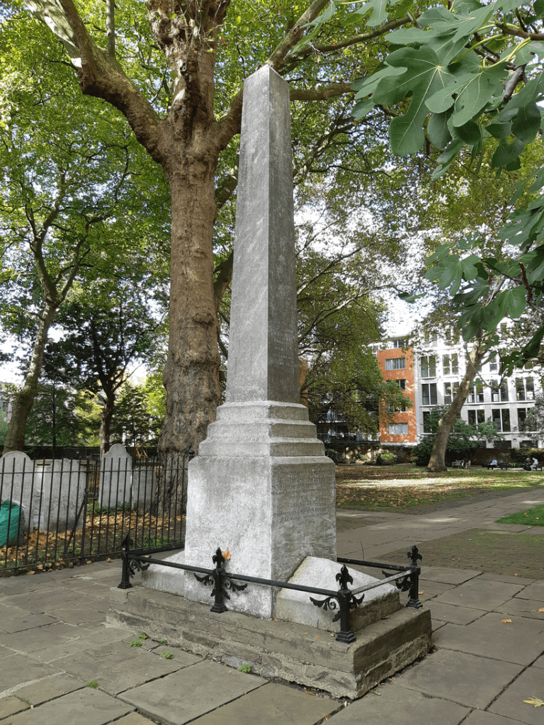 Daniel Defoe’s obelisk is one of the most imposing and central memorials at Bunhill Fields. Upon his death in 1731, The Robinson Crusoe and Moll Flanders author had no public memorial, dying in relative obscurity, much like Blake. It’s presumed that Defoe was also hiding from his creditors at the end of his life, so obscurity offered something of a safety blanket. It is a rumour oft-repeated that he was buried under the surname of Dabow, thanks to a clerical error on the part of the gravedigger, but like so much of his burial history, we can never be sure.