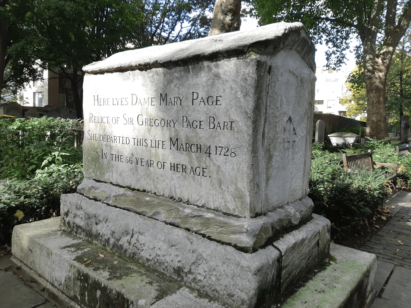 However, the final grave of interest is to a woman rarely discussed outside of her strange epitaph. Mary Page was the wife of wealthy merchant, MP and shipwright Sir Gregory Page who made his substantial fortune in the East India Trade. Born into privilege (inheriting his father’s brewery as a young man), he worked his way up the ranks, eventually becoming a director of the East India Company. He died in 1720 and left an enormous fortune of over £800,000, with the greatest sum (estimated at £700k) going to his eldest son. Mary and their three other children shared the remainder, which would have kept her in comfort until her own death, eight years later.