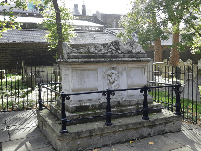 John Bunyan’s grand memorial is hard to miss, being a huge tomb, topped with an effigy of the writer. A prolific author and nonconformist preacher, he is one of Bunhill Field’s most recognisable residents, despite being frequently covered in squirrels and pigeons. Born in 1628, his work ‘The Pilgrim’s Progress’ was a long-standing labour of love, and a controversial creation at the time, despite being religious, as it was a work of fiction. In the years between its publication and Bunyan’s death in 1688, The Pilgrim’s Progress had thirteen published editions and is believed to be the second-most read Christian text, next to the Bible.