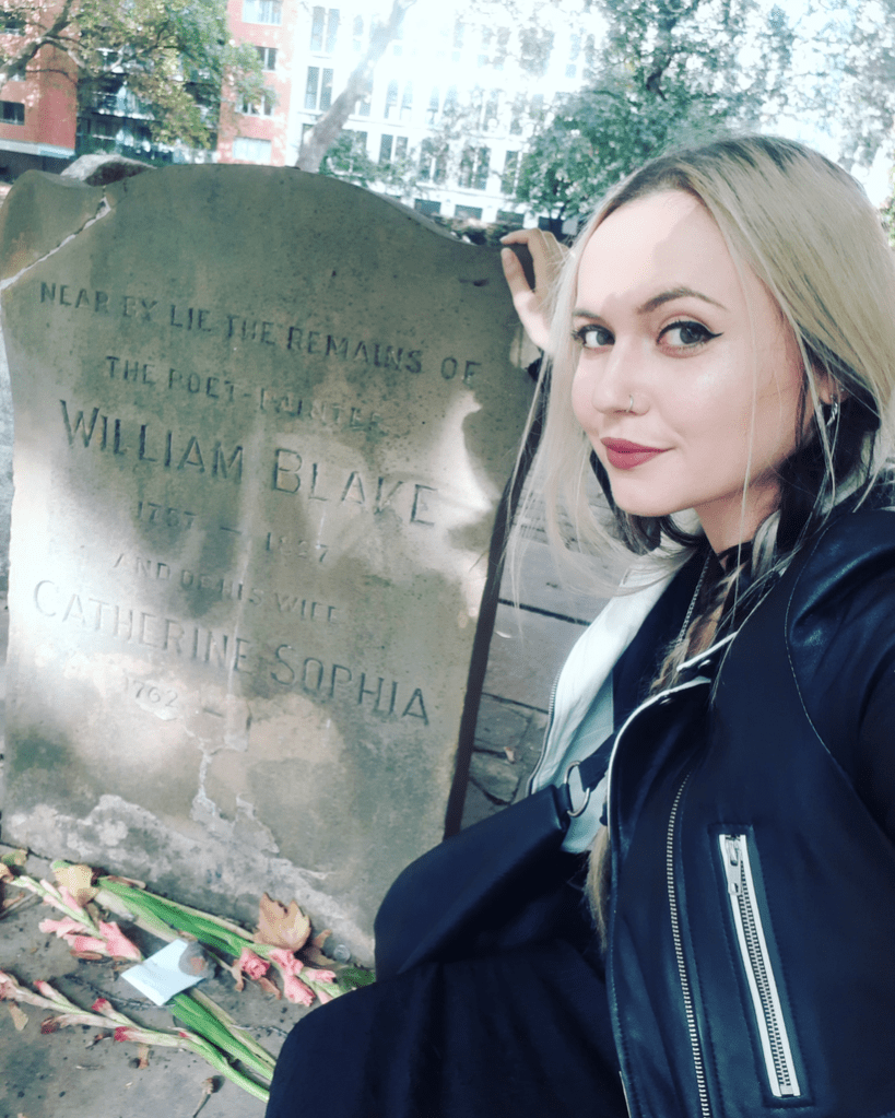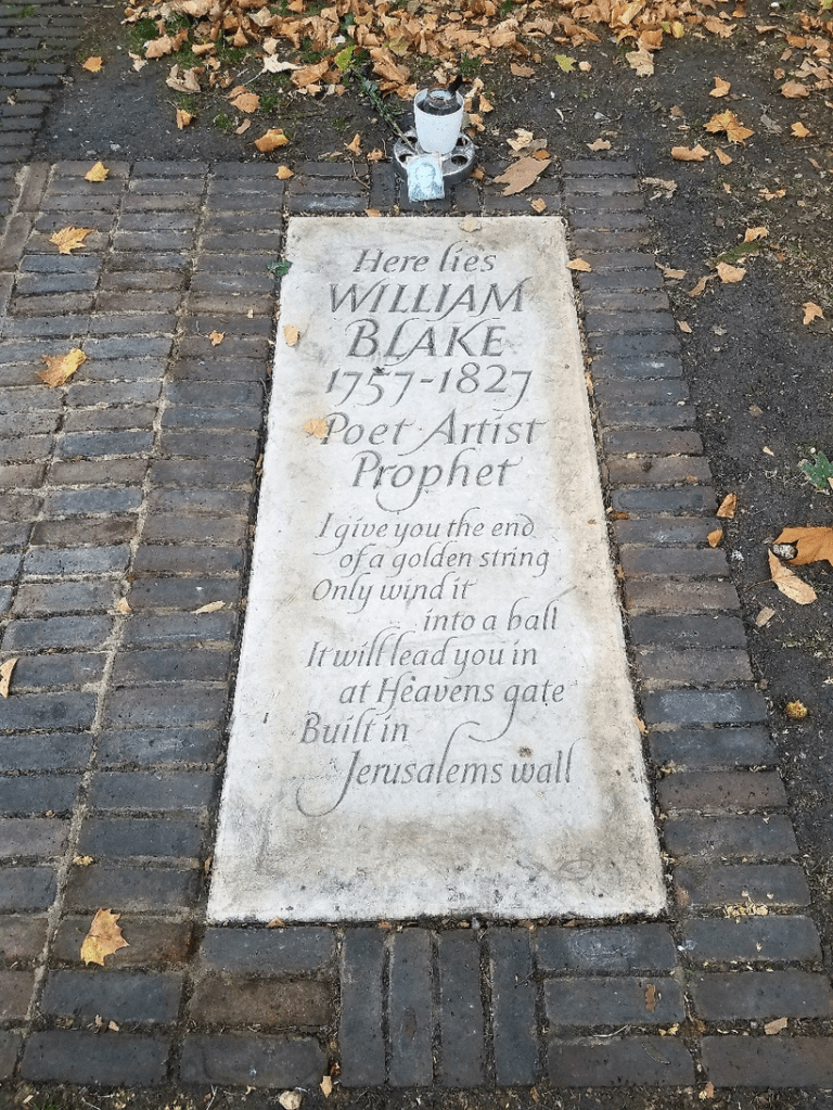 There had been a marker for centuries, until damage obtained during WWII caused the Corporation of London to remove many memorial remnants and clear a part of the site for use as gardens. Blake’s memorial was moved to a different section, set beside an obelisk commemorating fellow writer, Daniel Defoe. Thankfully, the original records remained, which showed that the plots had been arranged in a grid and the original resting place could be found. There are few individuals who can boast a two memorials in the same burial site, and Blake joins such iconic contemporaries as Edgar Allan Poe who also has two memorials in one graveyard.