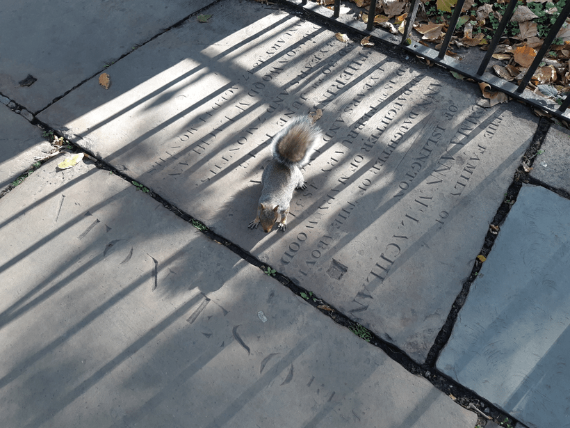 But before we look at Bunhill Fields’ most famous residents, a note on squirrels. The burial ground is one of few green spaces in the borough and so thrives as an oasis for grey squirrels and urban wildlife. With so many commuters leaving crumbs of their lunches behind and passing through the site every day, the furry beasties are emboldened to say the least. Their familiarity with humans is striking, as they comfortably approach walkers for snacks and attention, encouraged by the occasional visitor with a fist full of seeds. However, as pleasant as a Snow White fantasy seems, the horror stories of vicious squirrels are endless. Whether they jump from trees of scuttle up your legs, be wary. One Tripadvisor review summarises Bunhill Fields’ wildlife perfectly; ‘Squirrels. Like tonnes of them. Super cute. Super aggressive.’