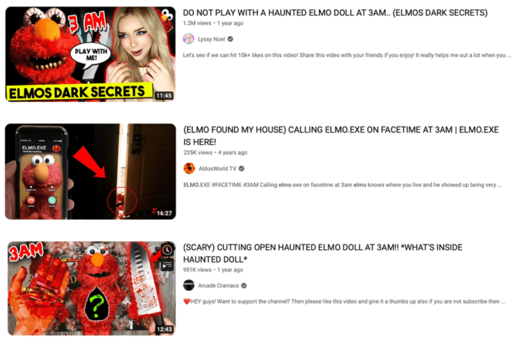 Unsurprisingly, James’ Elmo doll wasn’t kept in the house for too long afterwards, and we can’t be sure if they accepted the replacement toy voucher from the Fisher Price company But we can be sure that Elmo’s killer tendencies had quickly imprinted into the internet’s spookier quarters. Even today, a cursory YouTube search leads to hundreds of videos about sinister Elmo experiments, with questionable click bait titles such as ‘DO NOT PLAY WITH A HAUNTED ELMO DOLL AT 3AM’ (alright, but why are you shouting?), ‘DISTURBING TRUTH BEHIND THIS HAUNTED ELMO DOLL’ and ‘(SCARY) CUTTING OPEN HAUNTED ELMO DOLL AT 3AM!! *WHAT’S INSIDE HAUNTED DOLL*’…
