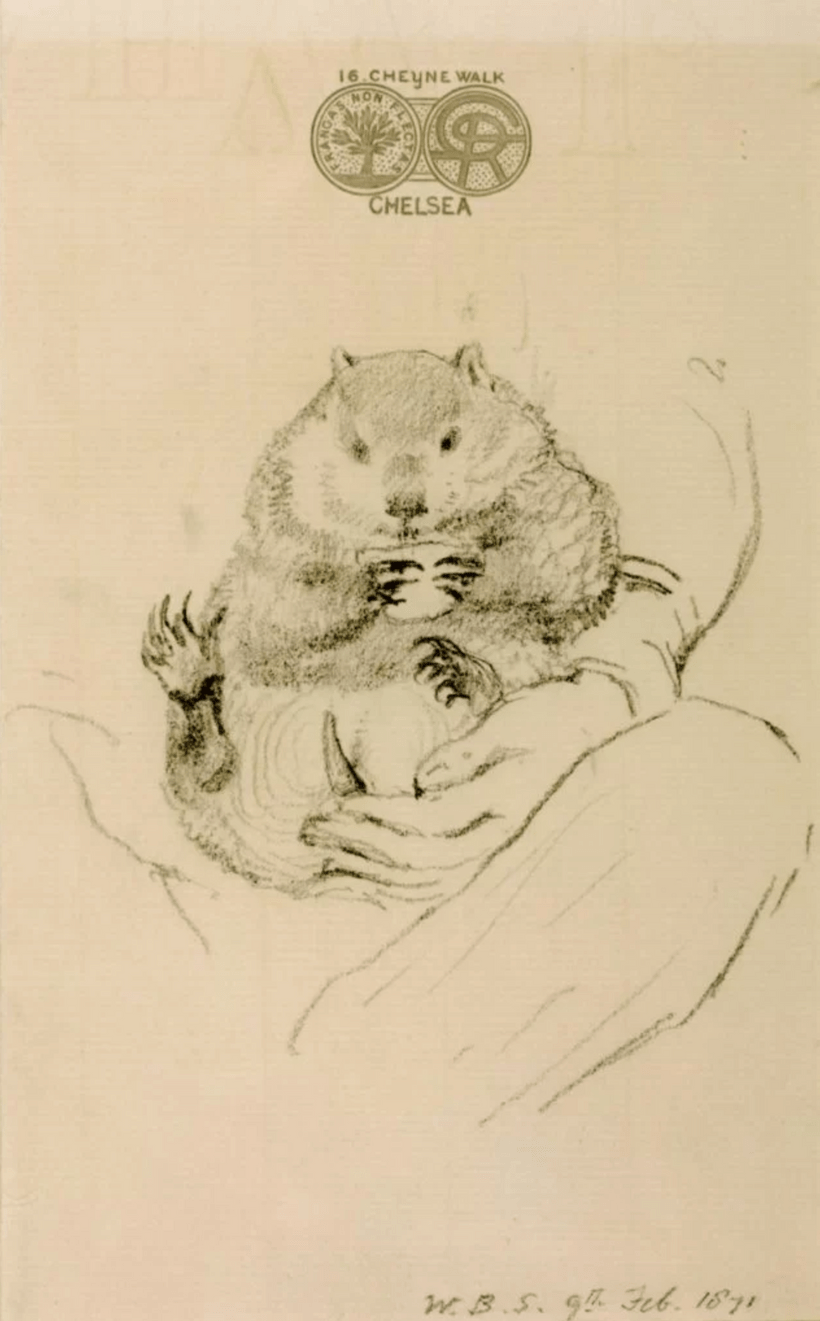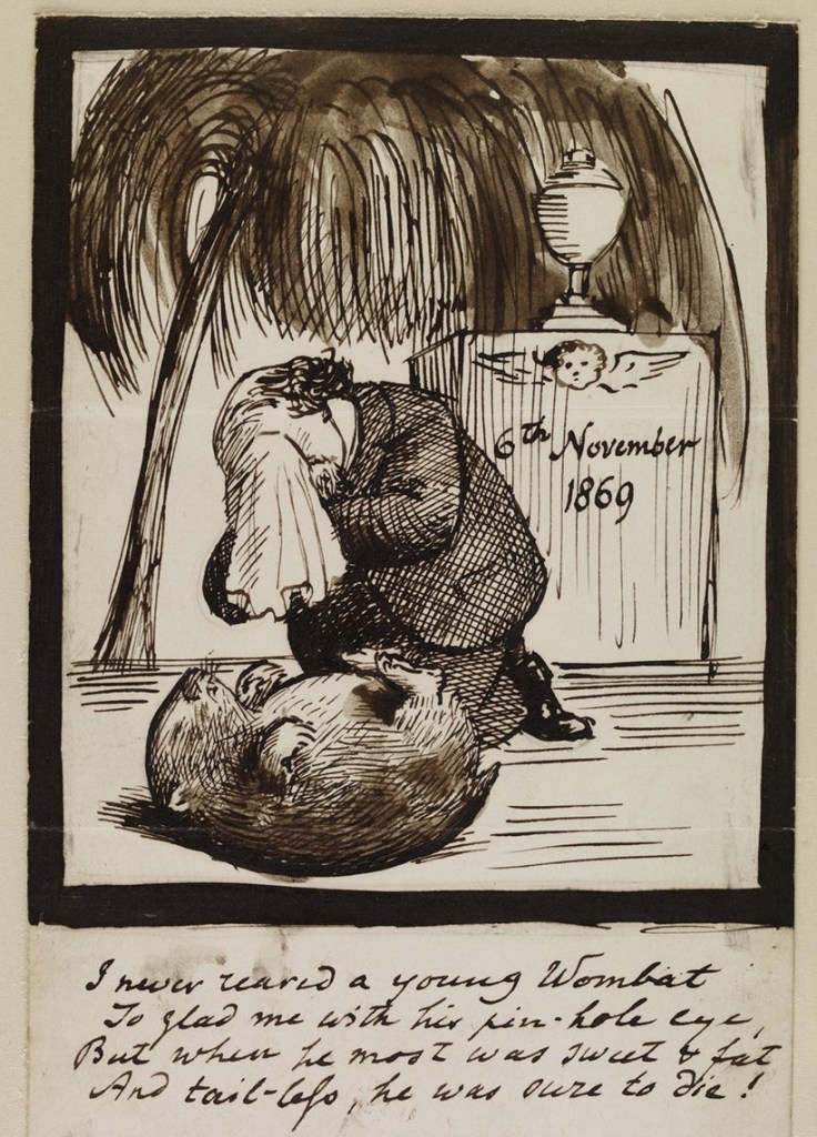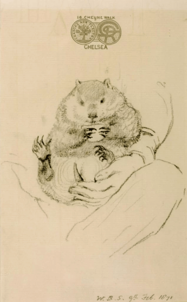Questionable name choices aside, he went on to pen many drawings, paintings and poems to wombats, delighting in the clumsy nature and satisfying name of the animal. Following Top’s eagerly-awaited arrival in the Rossetti household, he wrote to his brother exclaiming that the creature was ‘a joy, a triumph, a delight, a madness!’[1] Top was the showpiece of Rossetti’s home menagerie, with visitors greeted with Top’s presence in the household, causing all manner of mischief. On at least one occasion, the wombat was used as a butler style novelty, brought to the table alongside brandy and cigars. There were many more instances of Top causing havoc in the household. On one occasion a woman was sitting for a portrait when she realised that Top had helped himself to her hat. In response, Rossetti did not apologise, but exclaimed ‘Oh, poor wombat! It is so indigestible!’