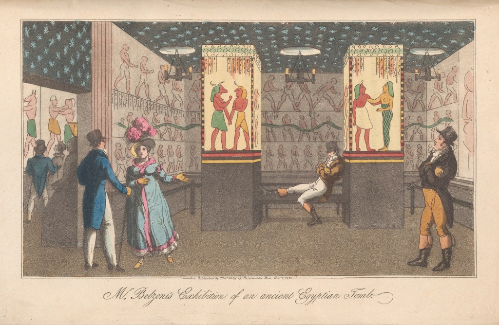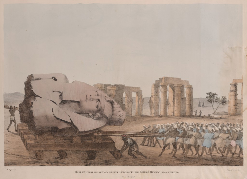 Between 1820-21, he would place many of his personal ‘findings’ on public view, staging a substantial year-long exhibition in Picadilly’s Egyptian Hall and later, taking his models to Paris. These ‘findings’ were ultimately looted objects, and included a white alabaster sarcophagus from Seti I’s tomb and the head of the ‘Younger Memnon’. Following this exhibition, the contents were put up for sale, with two of the greatest bidders being Sir John Soane and The British Museum (who acquired the sarcophagus and head respectively).