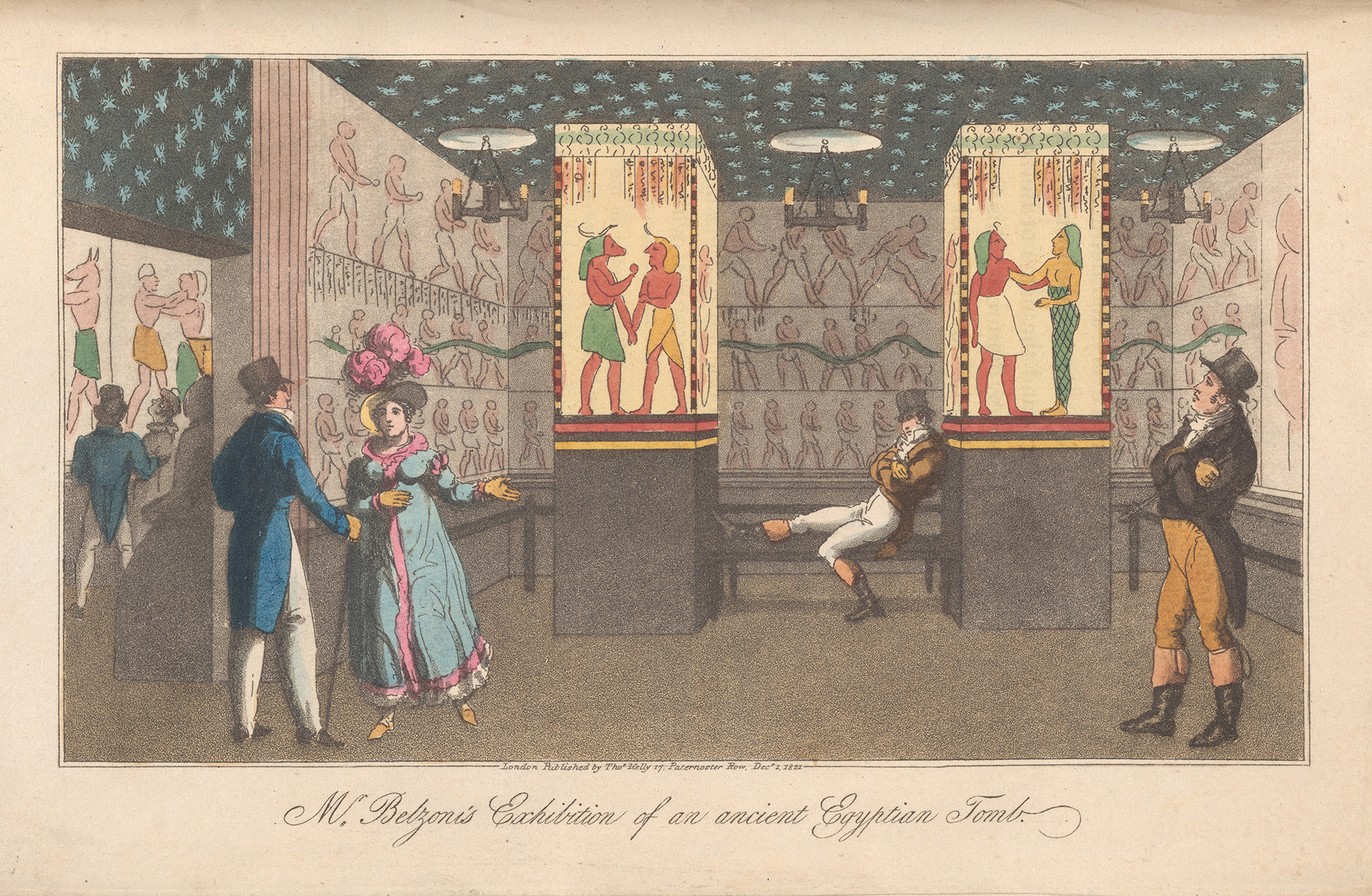 Prior to their sale, Belzoni was said to have popularised the exhibition at the Egyptian Hall with a ‘mummy unwrapping party’, wrapping himself in bandages to welcome the guests, before the ancient cadaver was brought out. Assisting Belzoni in this first unwrapping was surgeon Thomas Pettigrew, who grabbed and ran with the party theme for years to come (although some of these later mummies may have been snatched from English burial grounds under cover of darkness, rather than Egyptian tombs). Advertised as an event for medical professionals, Belzoni’s biographer regarded it as ‘a shrewdly-aimed advertisement, calculated to bring in a large body of professional men.’[2] Following its unravelling, Belzoni’s mummy was ‘displayed, alongside a motley collection of Egyptian artefacts, at the Egyptian Hall.’[3]