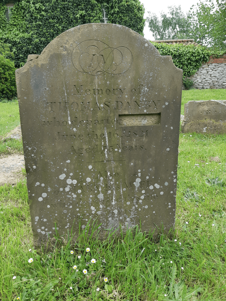 In the churchyard, there’s a scattering of stones with varying decorative designs, including crossed extinguished churches and drapery. While most memorials are upright headstones, towards the north end of the church are a handful of unusual tombstones and larger memorials to the Danby family.