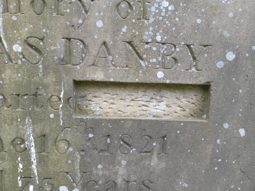 I particularly enjoyed the corrected headstone of Thomas Danby, who died June 16th 1821 aged 73. A rectangular section of his stone was removed, presumably due to a mistake made by the memorial mason, and was never replaced. Or, was not done so firmly enough. What could have merited such a messy removal, including the last d in departed?