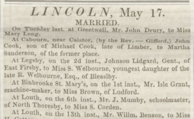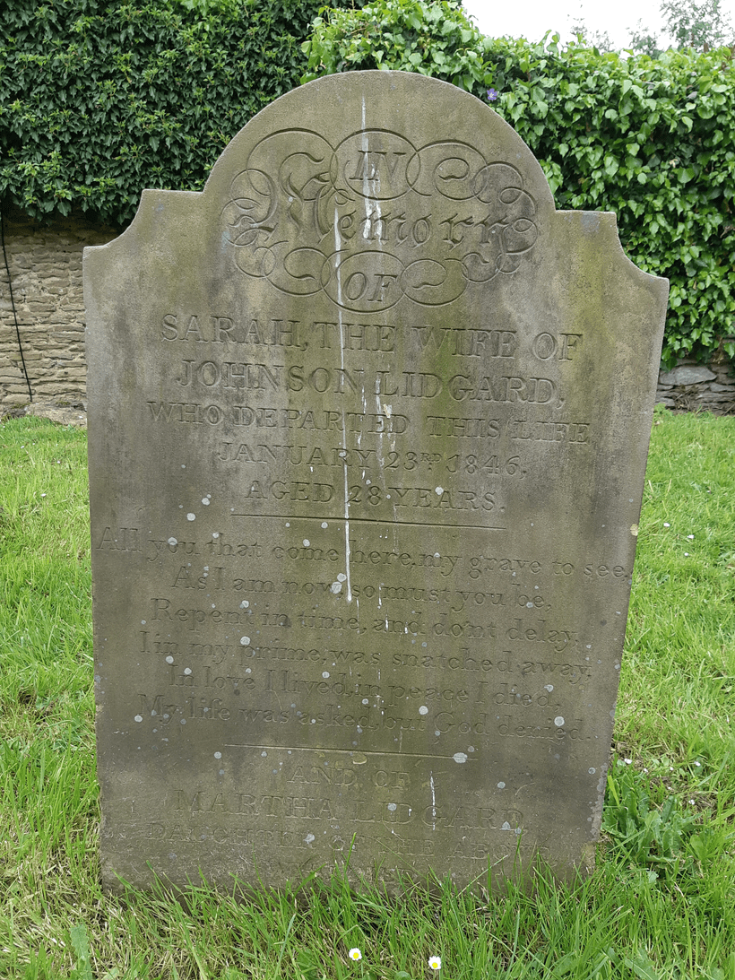 However, the grave of Sarah, wife of the brilliantly named Johnson Lidgard, offered a little more insight. At least about her husband. Johnson Lidgard and Sarah Welbourne married at St Thomas’ Church, Legsby, Lincolnshire in 1844 when they were both 27. Johnson, a Lincolnshire native, was a labourer, while his father before him was a carpenter. No profession is recorded for Sarah, but her father Richard Welbourne was a Farmer.