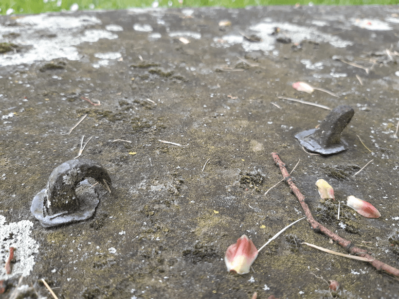 · A Victorian tombstone, once decorated with elaborate ironwork. Presumably taken to aid the war effort (although we know these metals were rarely used for this purpose and were generally scrapped), what remains is a rather sinister series of hooks in the shape of a cross.