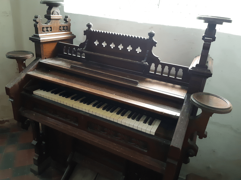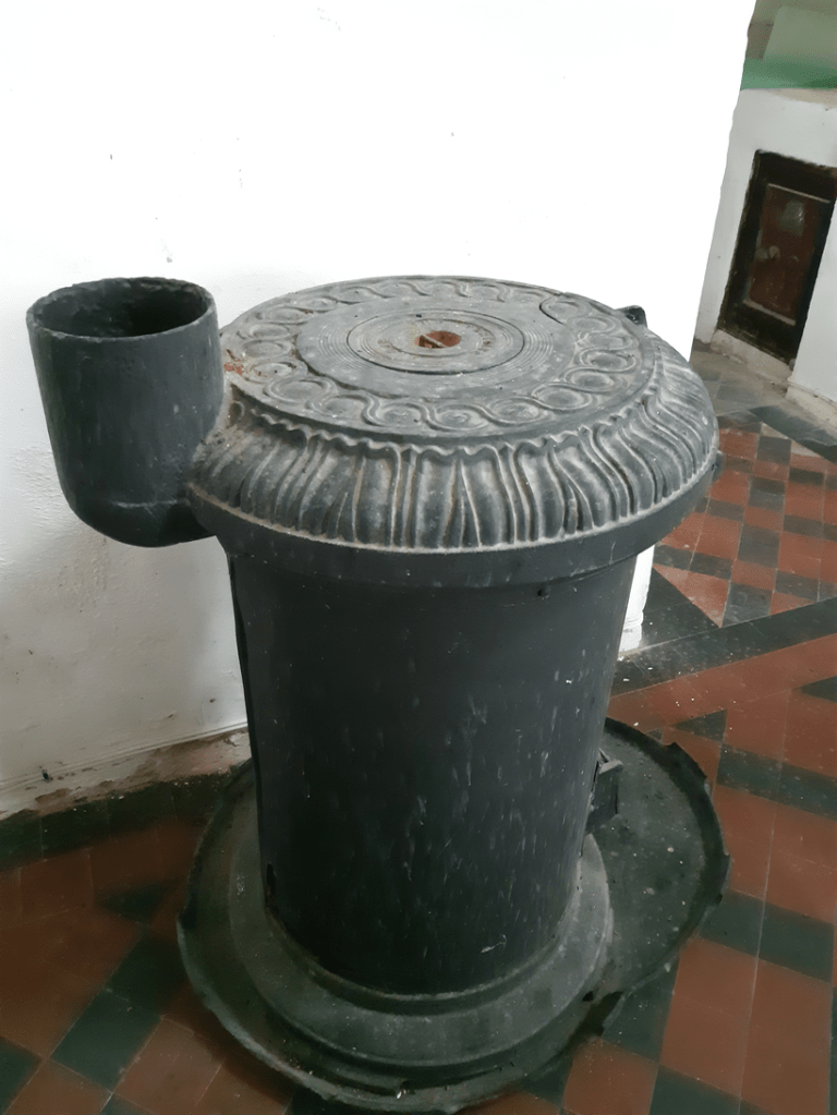 · A Victorian, long-disconnected cast iron tortoise stove stands by the south wall, reminding us of the central heating efforts of days gone by.