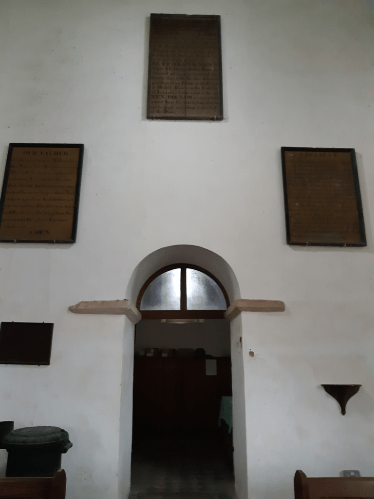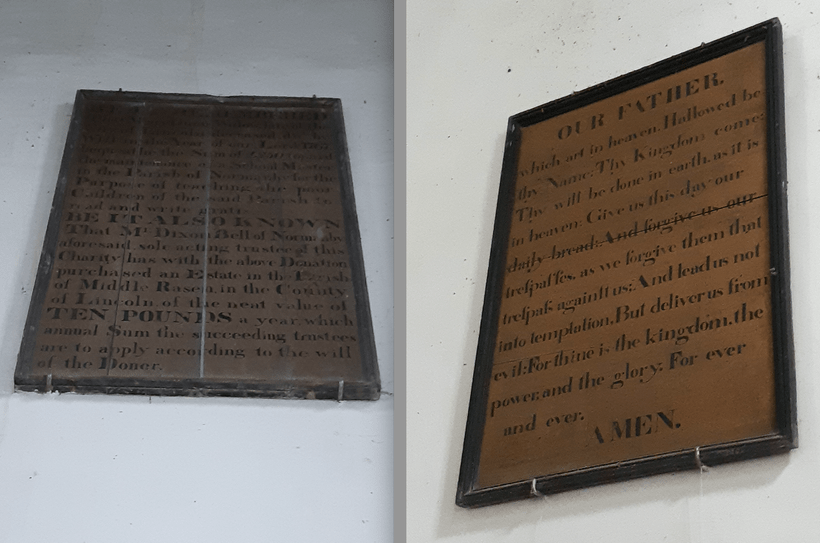 While the walls are predominantly unremarkable plasterwork, one is adorned with 18th century benefaction boards. Between the Lord’s Prayer and Apostles Creed, is a similarly designed large board dated 1767 giving thanks for prominent citizens’ (such as Mr Dixon Bell of Normanby) substantial donations to the church and poor school.