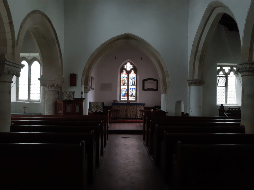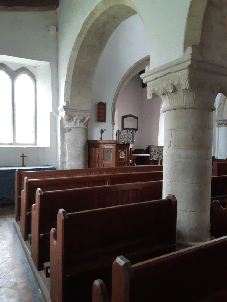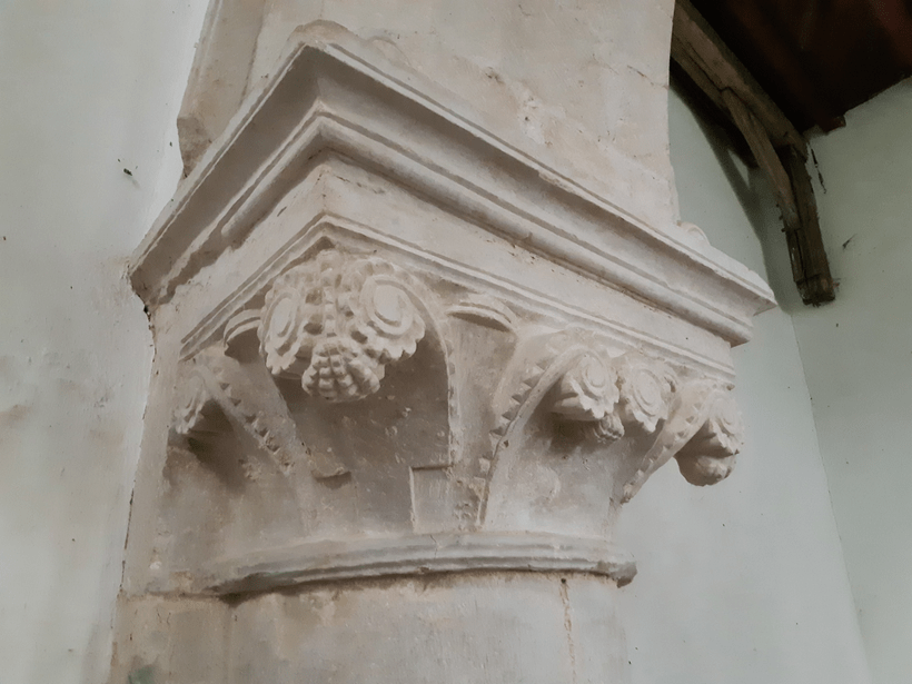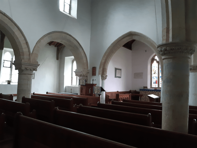The church interior is a simple affair, but shows how the Victorian renovations sit against a far longer timeline of ecclesiastical architecture. The south doorway is a Victorian replica of a 14th century moulded doorway, yet at the other end of the church, spectacular – and rare – Norman capitals are perfectly preserved. The arcade (believed to be Norman) is celebrated for its elaborate decoration. According to Historic England, ‘The single chamfered round arches have rounded stops and chamfered hood moulds. The south arcade has circular pier, responds, bases and abaci with formal stiff leaf capitals supporting C13 double chamfered pointed arches.’[1]