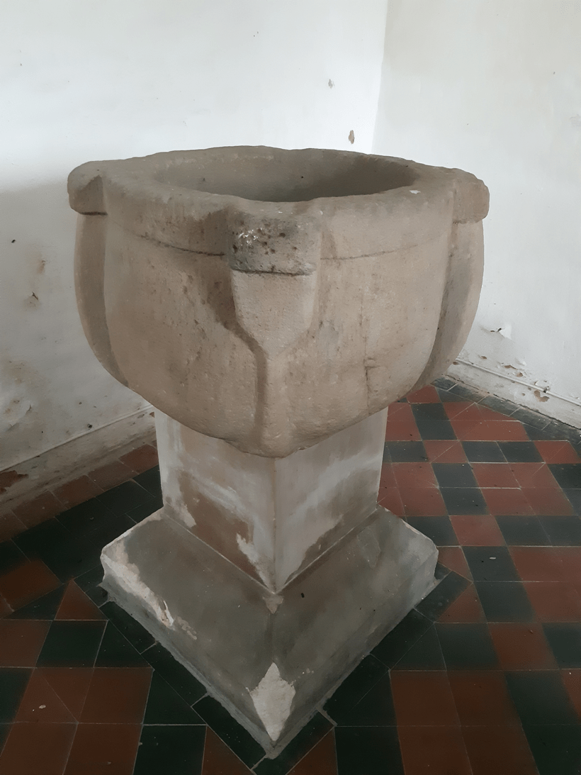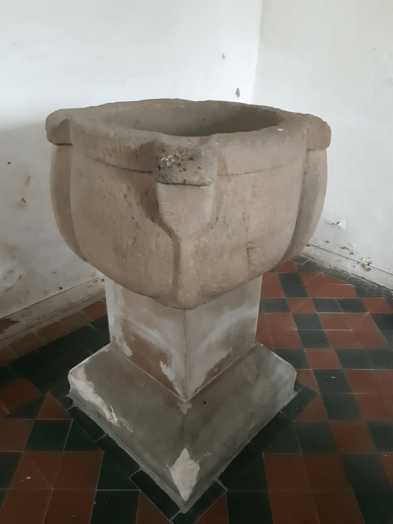 The font of St Peter’s is an example of centuries-old reuse. Rather than being custom-made for the purpose of baptism, this particular font was originally a kitchen mortar from the medieval period.[2]