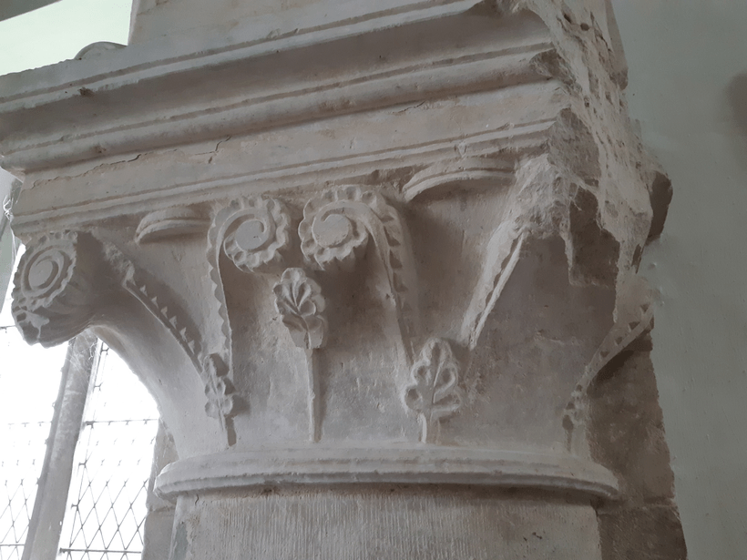 In layman’s terms, the capitals, being the decorative tops of columns are decorated with coils of ‘abaci’, being the plural of abacus – the counting device consisting of rods and moving beads. These are, in turn, decorated with curling crockets (a small, carved ornament, commonly featuring buds) to great effect. The other capitals, being far later, are decorated with a more substantial, chunky leaf decoration.