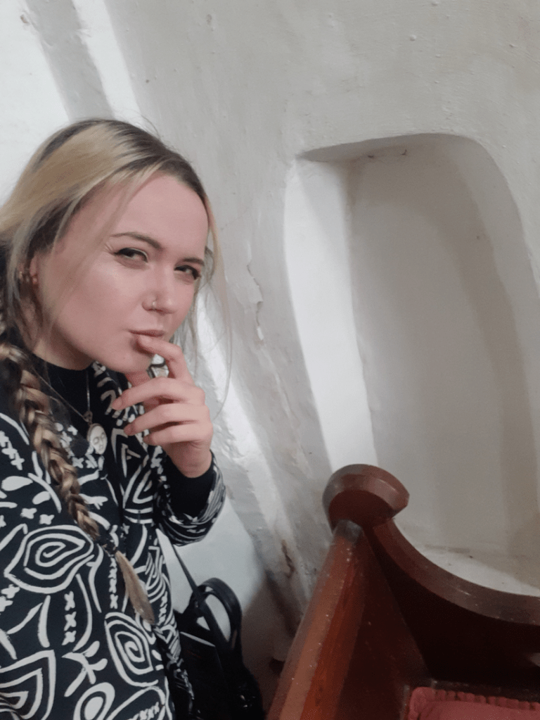 One of my personal favourite finds was the bricked-up medieval squint (demonstrated further by my squinting at it in the photo. Gettit? Comedy genius, me.) Squints were holes in the church building, allowing the congregation – who could not see the altar from their position – to witness the elevation of the host (the bread) during the eucharist.