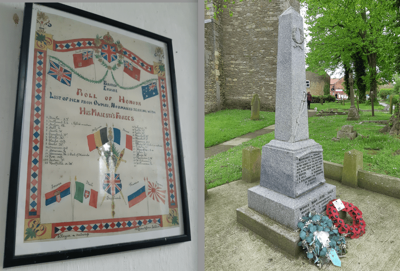· A hand-painted watercolour and ink Roll of Honour commemorates the lives of 29 local men from Normanby and Owmby who lost their lives in war. In the churchyard outside, a larger granite obelisk repeats these names, separated by the date of conflict.
