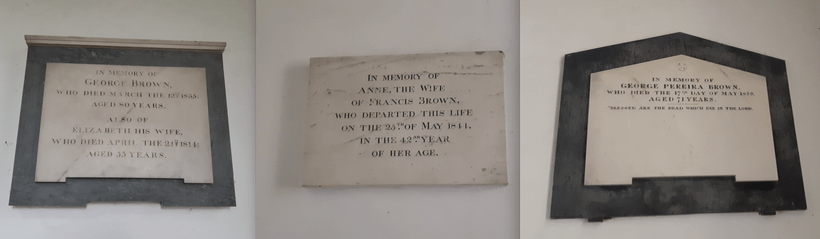 · Several simple wall memorials to the Brown family, dating from the 19th century.