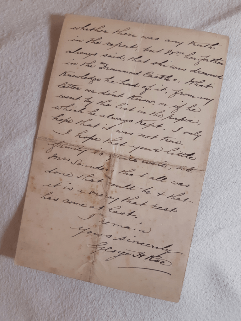 He seemed to have an aversion to speaking of anything about Southampton, especially to me. And he obliged to my writing at the last. He was lodging nearly a mile from my home. I never know of any letters that he ever received. We had a letter once, years ago, from Emmy, from Cape Town and we think a silly girl of ours destroyed it, before we were certain of her address, and I have always feared that our reply never reached her. He knows not whether there was any truth in the report, but Wm, her father always said, that she was drowned in the “Drummond Castle”. What knowledge he had of it, from any letter we don’t know, or if he went by the list in the paper, which he always kept. I only hope that it was not true.