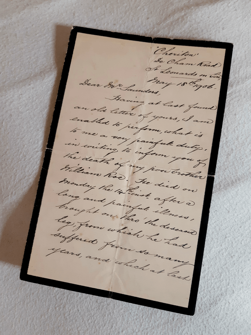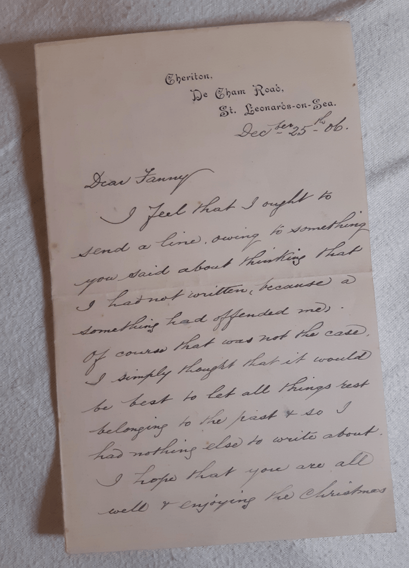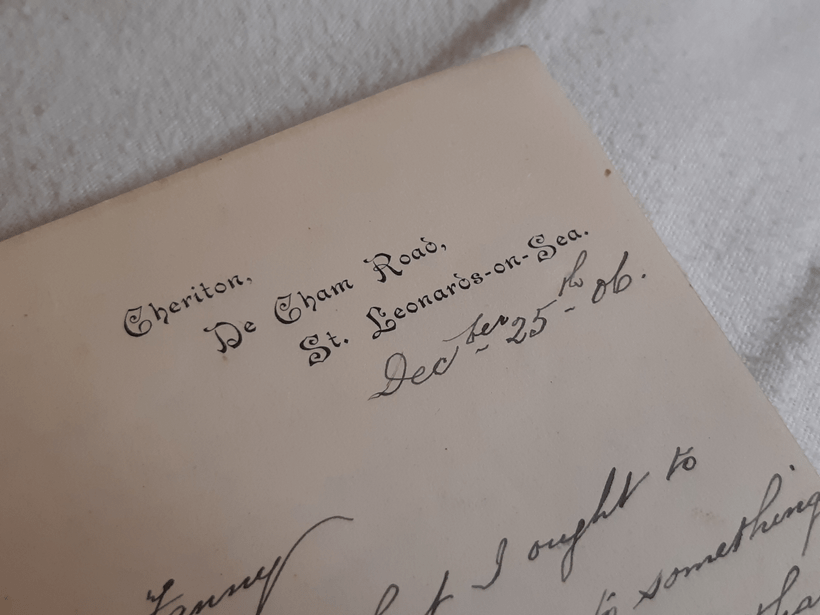 So what do we know? The writer of the letters is George H Roe, born in 1838. Born in Newport on the Isle of Wight, he eventually settled in Hastings where he and his family settled into a comfortable middle-class lifestyle thanks to George’s building trade. When George was writing these letters, he was living at ‘Cheriton’ on De Cham Road in St Leonards on Sea. Sadly, the names of these 3-storey houses are no longer used and presumably lost with the gateposts that once sat by the roadside. However, it seems that ‘Cheriton’ is now simply number 11, De Cham Road – a substantial five-bedroom terrace that seems to have magically escaped being converted into flats.